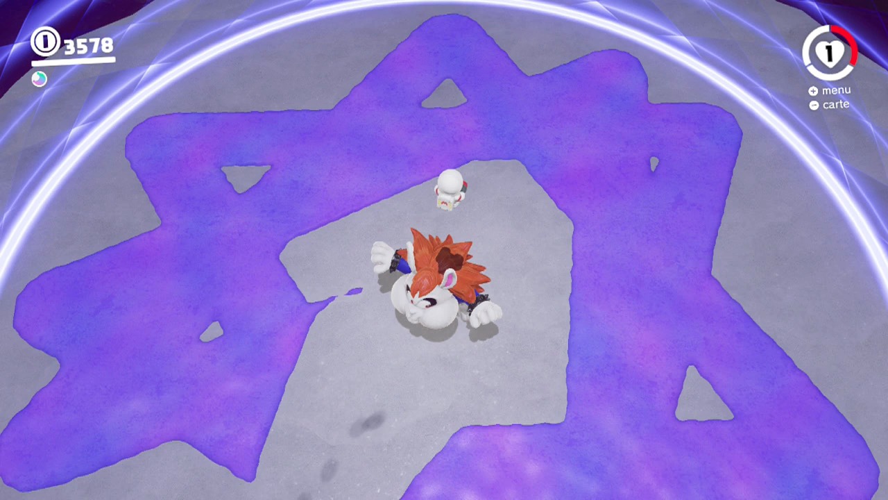 Ensuite, c’est le tour d’Harriet. Le vrai danger du boss vient des flaques de lave qu’elle laisse au sol après l’explosion de ses bombes. Pour infliger des dégâts rapidement, restez près d’elle et reculez quand elle vous lance ses bombes. Lancez Cappy sur la bombe en prenant soin de bien se positionner pour lui renvoyer. Sautez lui ensuite sur la tête pour la blesser.