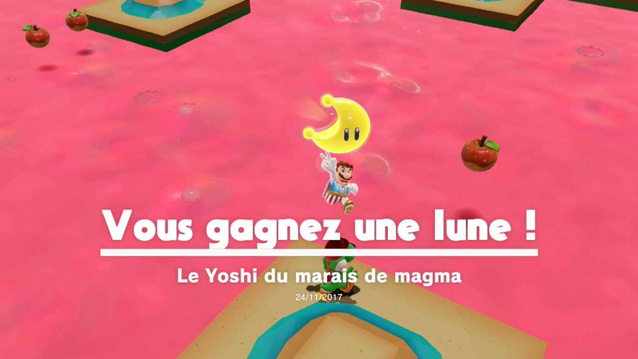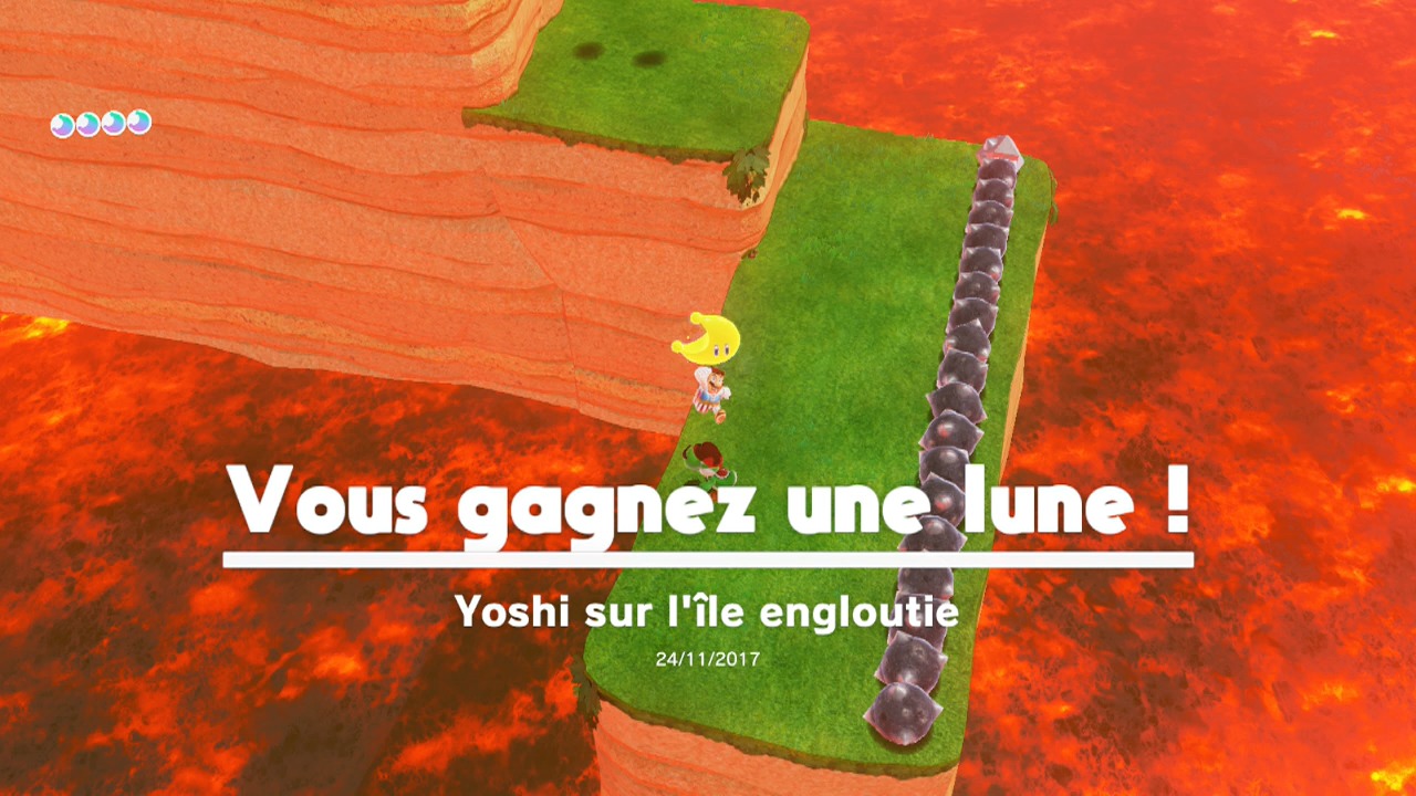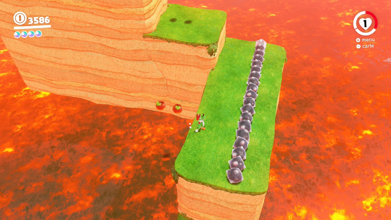 Ici, vous incarnez à nouveau Yoshi pour vous remplir l’estomac de fruits pour générer des lunes. Utilisez sa langue sur le rebord des plateformes pour passer par-dessus.