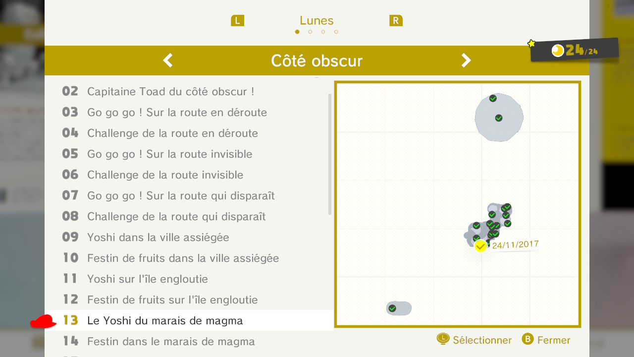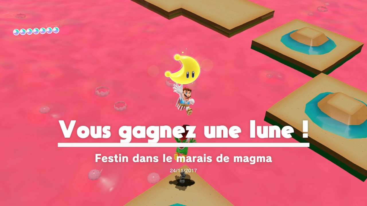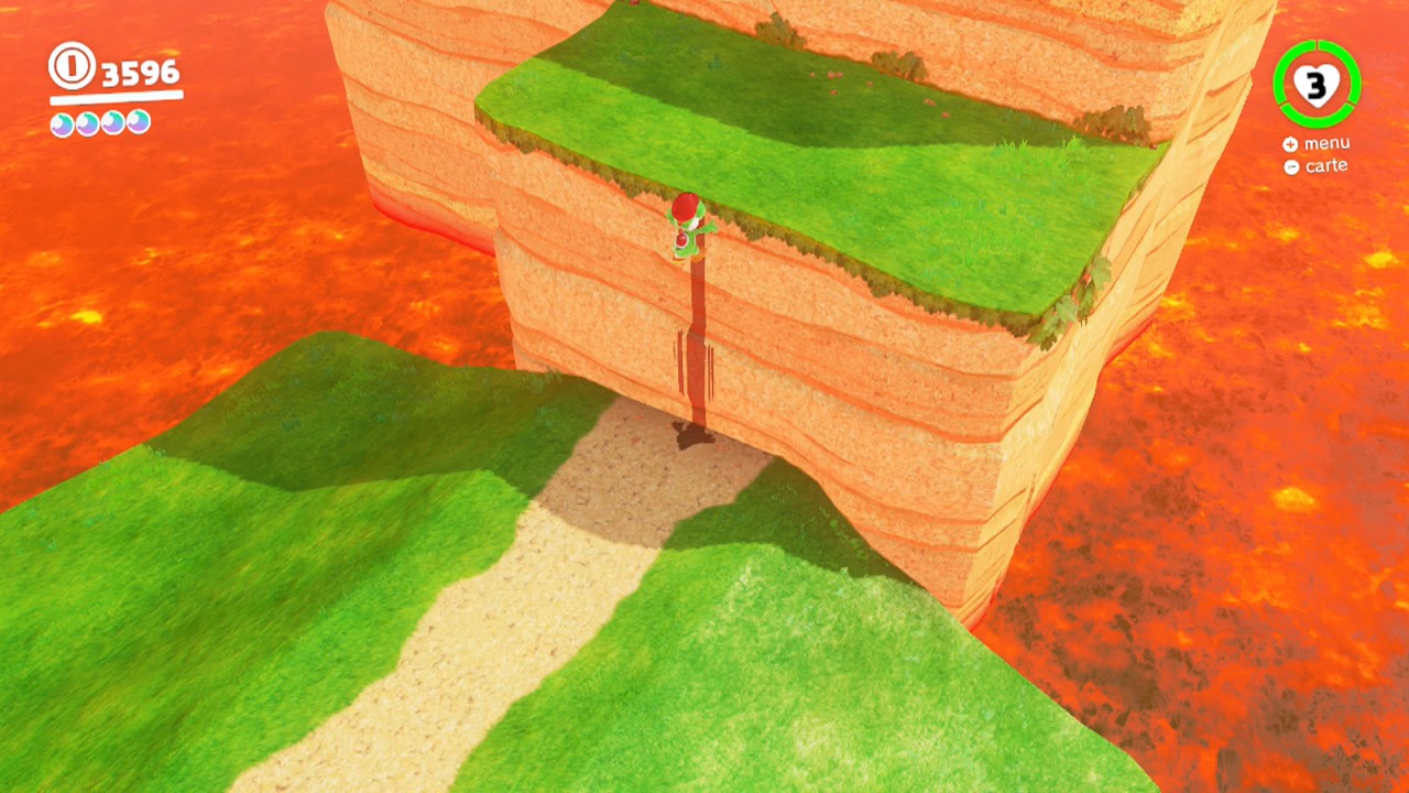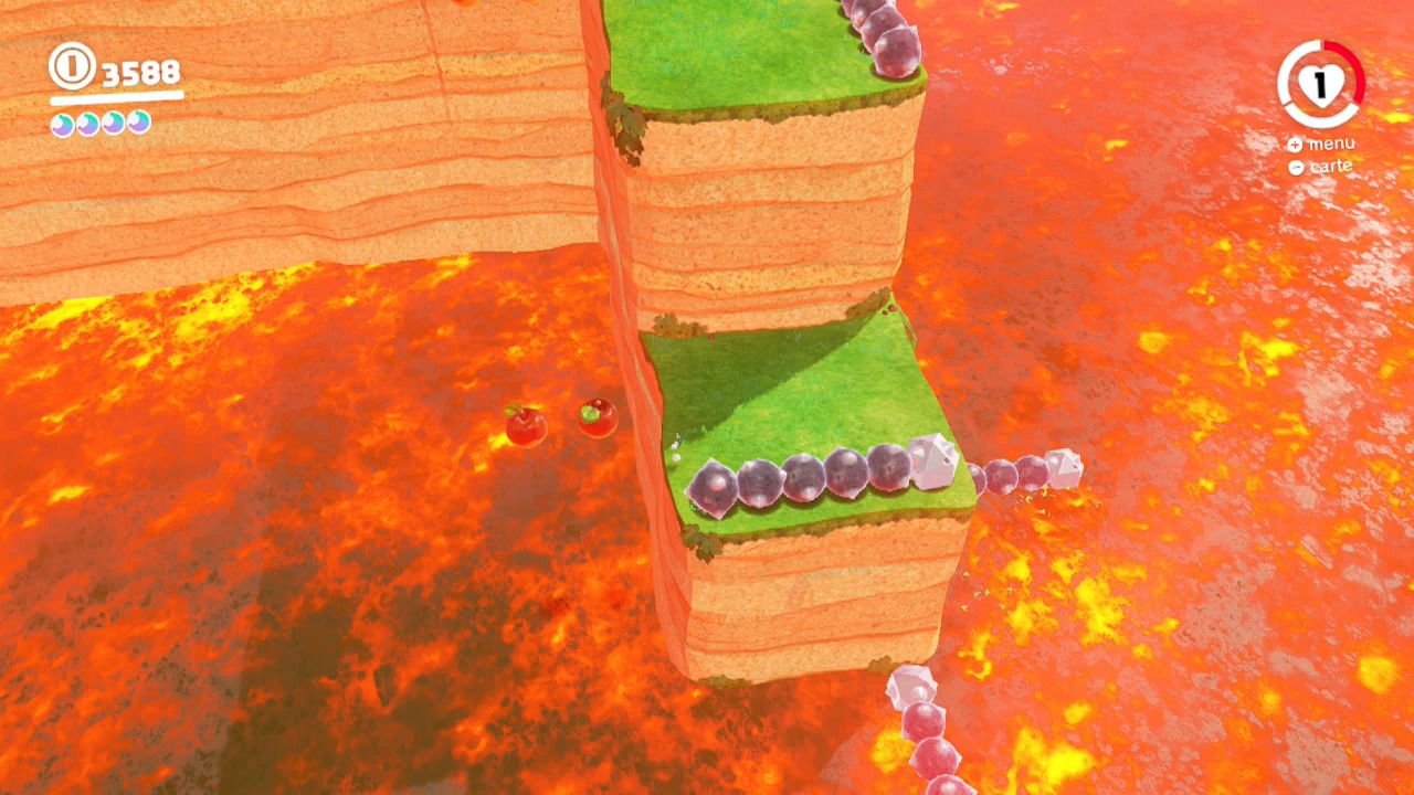 Ici, vous incarnez à nouveau Yoshi pour vous remplir l’estomac de fruits pour générer des lunes. Utilisez sa langue sur le rebord des plateformes pour passer par-dessus.