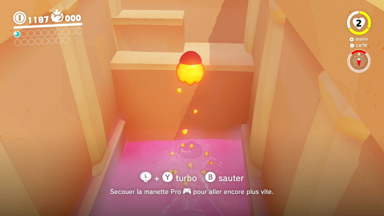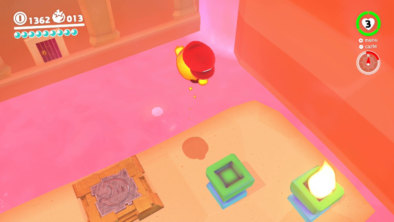 Progressez au nord à travers les plateformes au-dessus de la lave et trouvez-vous face au corridor avec la plateforme au milieu. Lancez Cappy sur la boule de feu et sautez sur la plateforme au bout du point de lave.