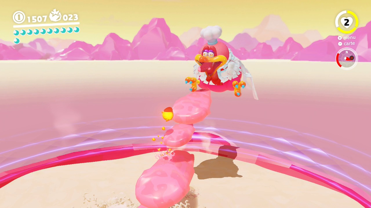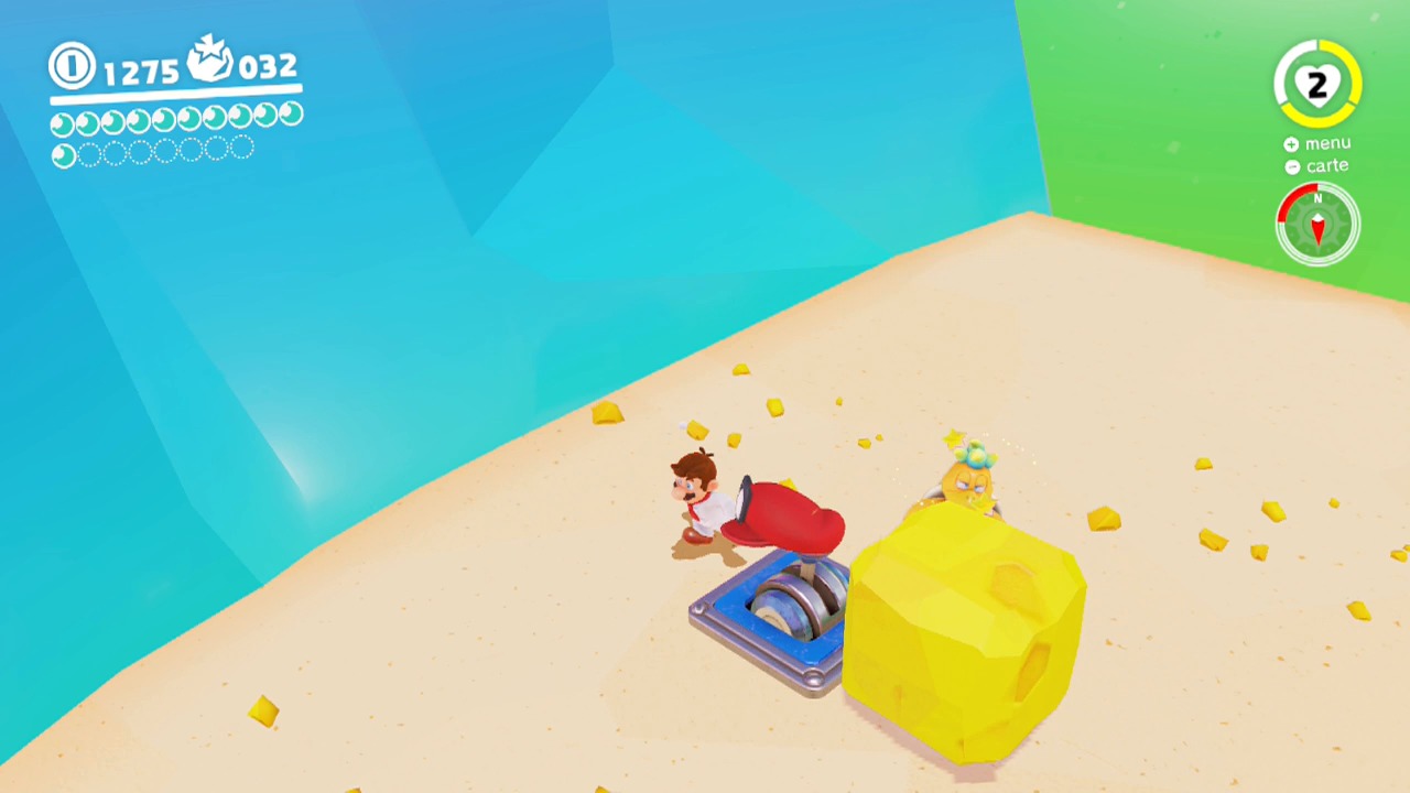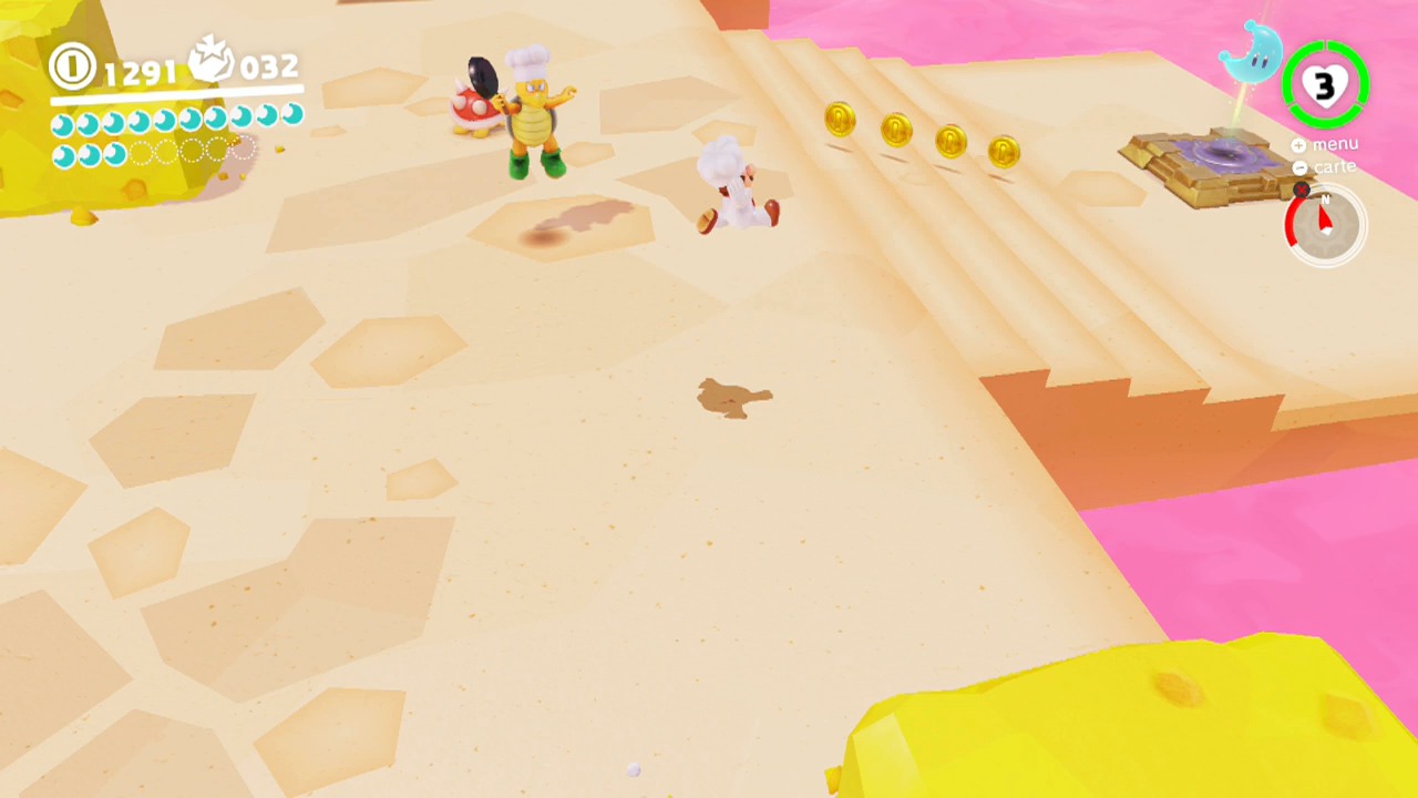 Au bout du parcours au nord de la carte, vous pourrez arriver au morceau de viande géant qui repose dans du sel. Possédez-le avec Cappy pour le déplacer au bord de la falaise.