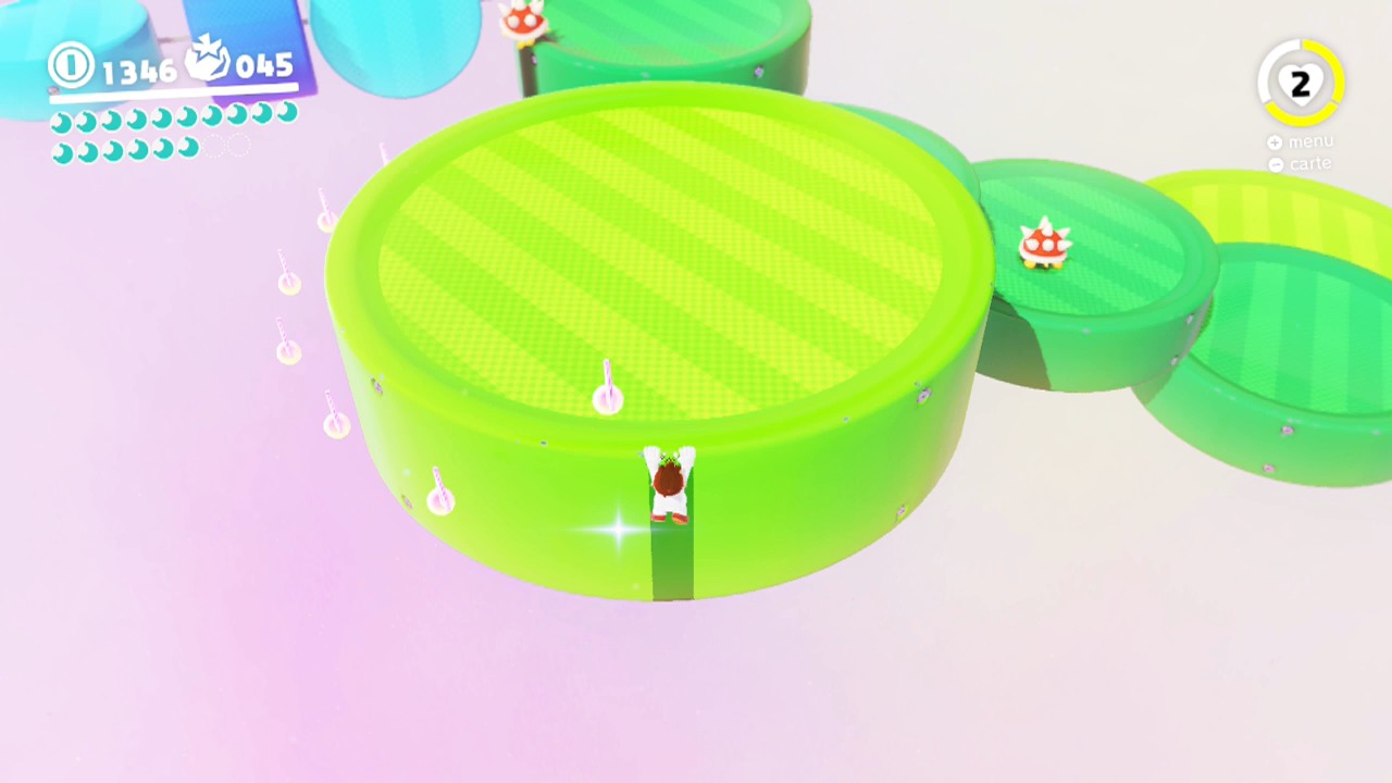 À mi-parcours du niveau secret, vous allez tomber sur une note de musique. La seule difficulté de ce défi est de récupérer les notes qui sont à la périphérie du grand plateau tournant. Laissez-vous pendre dans le vide et laissez le disque tourner pour récupérer les notes.