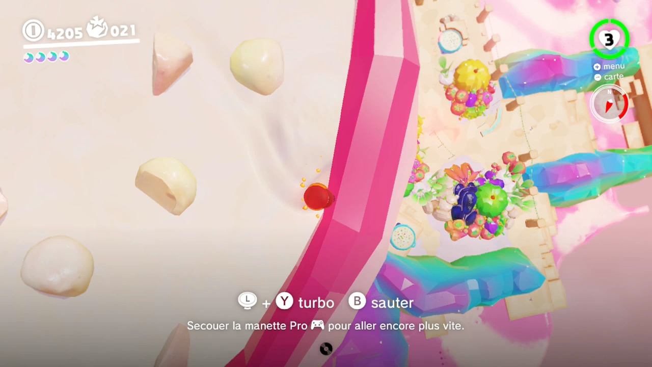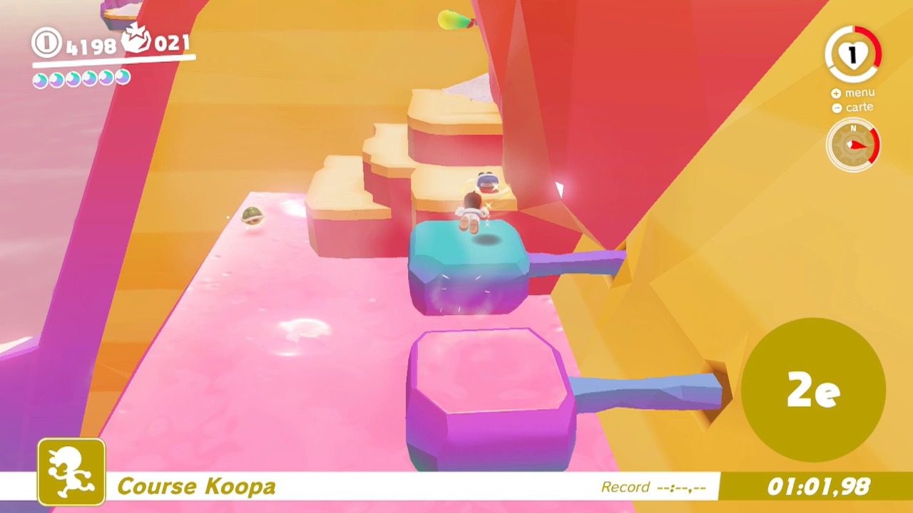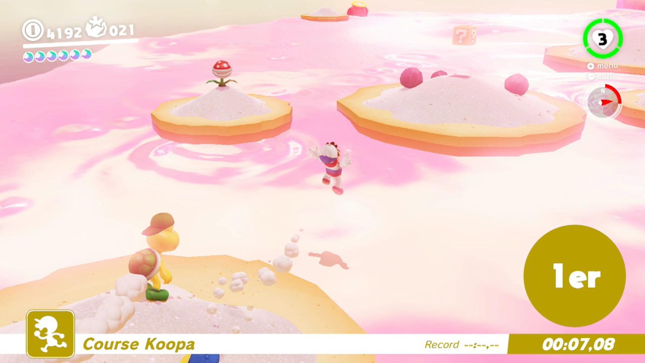 Il n’y a pas vraiment de raccourcis pour cette course. Si elle est dangereuse, il faudra néanmoins être téméraire. Prenez des risques et sautez sur les plateformes les plus éloignées possibles pour atteindre le début du sentier. Utilisez le saut Cappy spécial après un saut en longueur pour atteindre un maximum de distance en terminant avec un plongeon (ZL > Y).