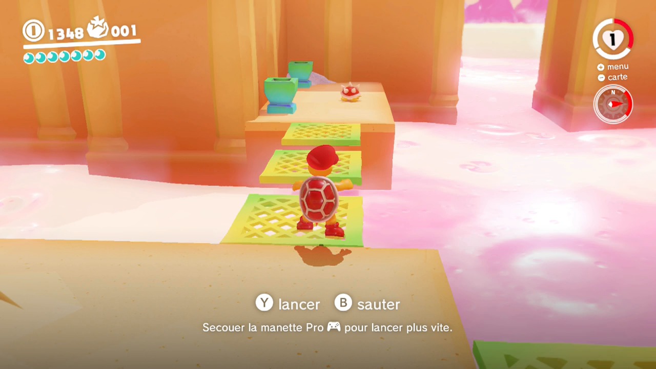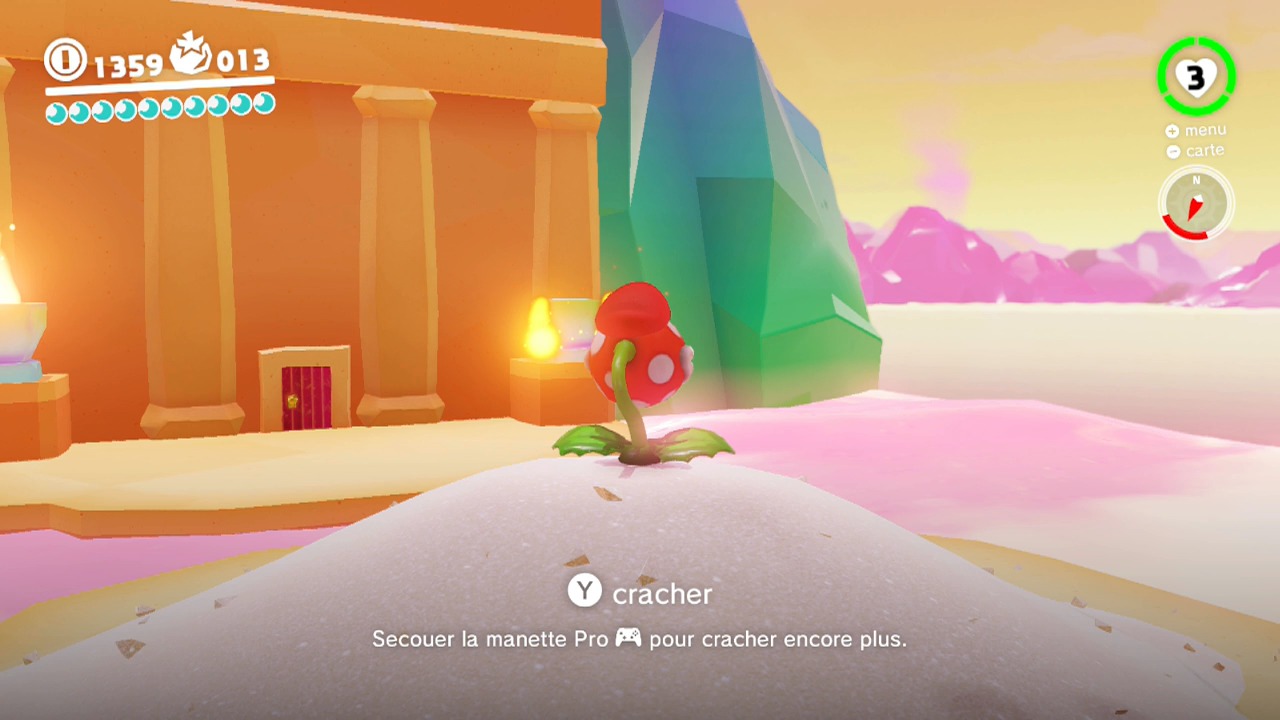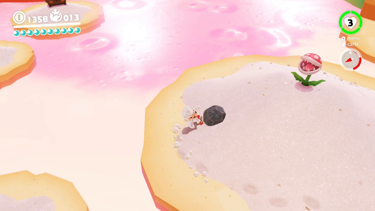 Puis, possédez-la avec Cappy. Si sa gueule n’est déjà pas occupée avec un caillou, elle mangera Cappy à la place. Tirez ensuite vos boules de feux sur les flambeaux.