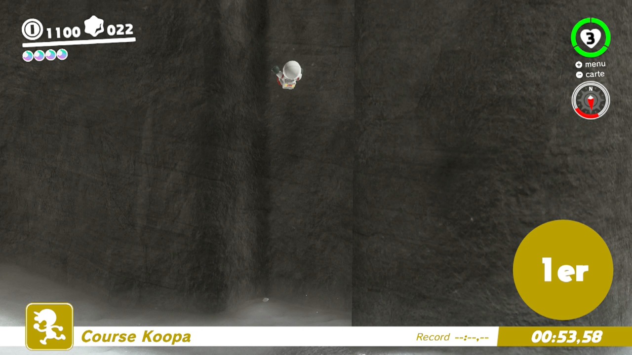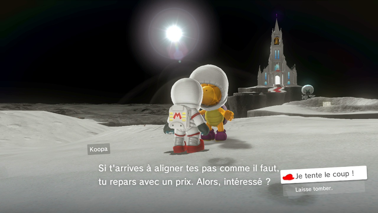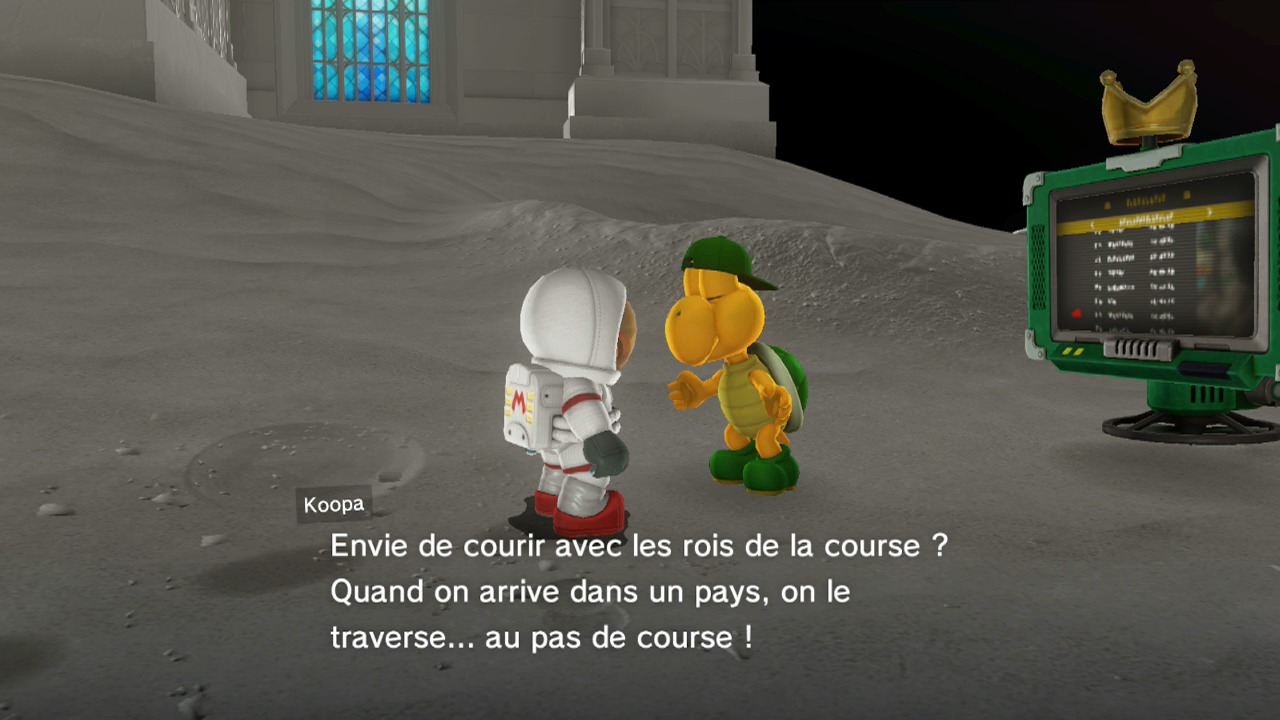 Un Koopa près de la salle des fêtes veut faire la course ! Arrivé le premier à la colonne de lumière pour remporter l’étoile.