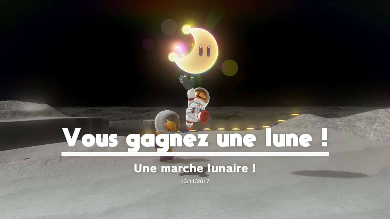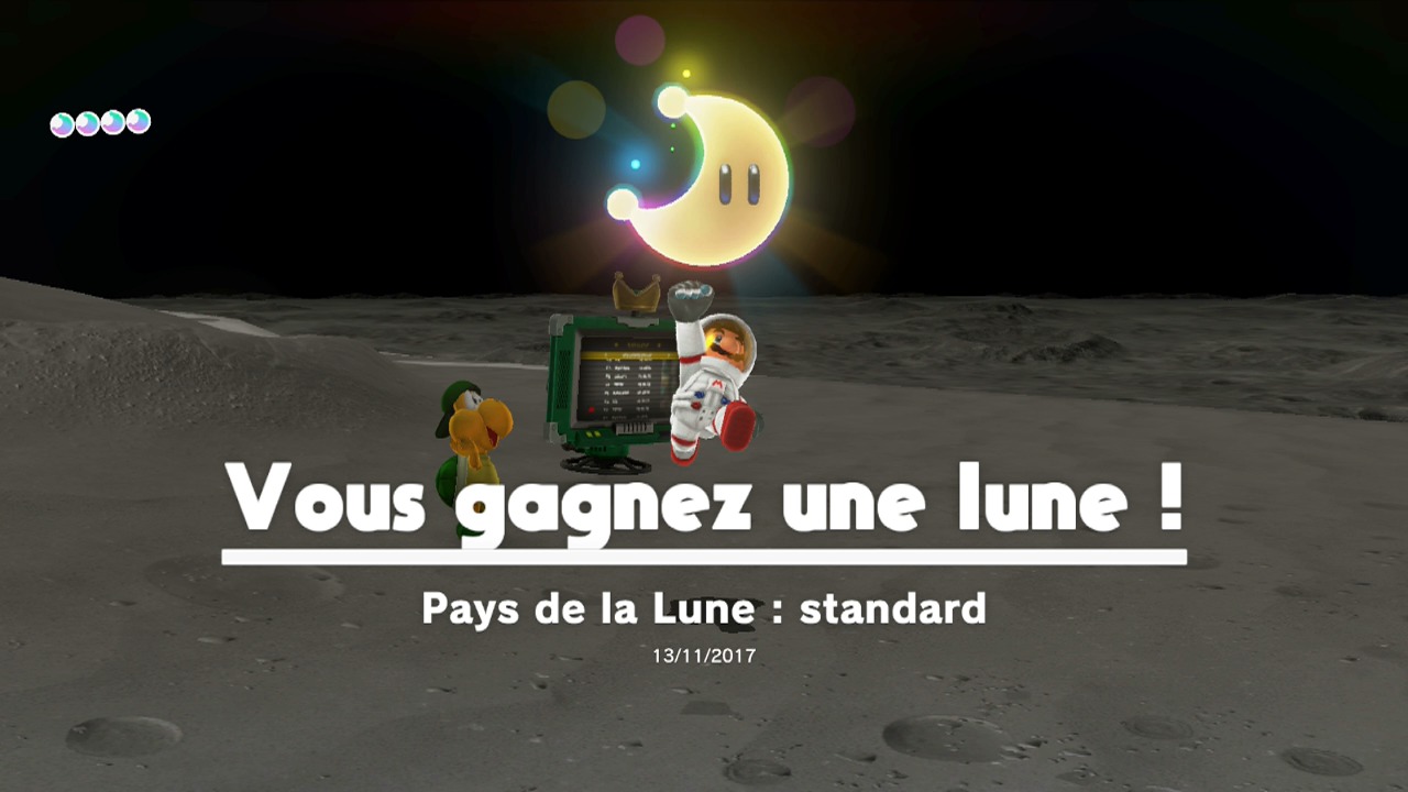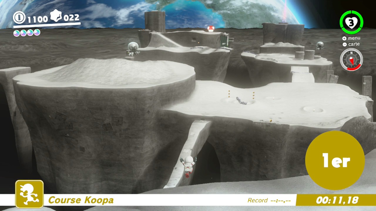 Pour vous repérez et créer un arc de cercle cohérent, prenez soin de couper légèrement sur le talus (sur la capture à droite) et de longer le cratère (en haut à gauche). Si vous atteignez un score suffisant, le Koopa vous récompensera avec une lune.