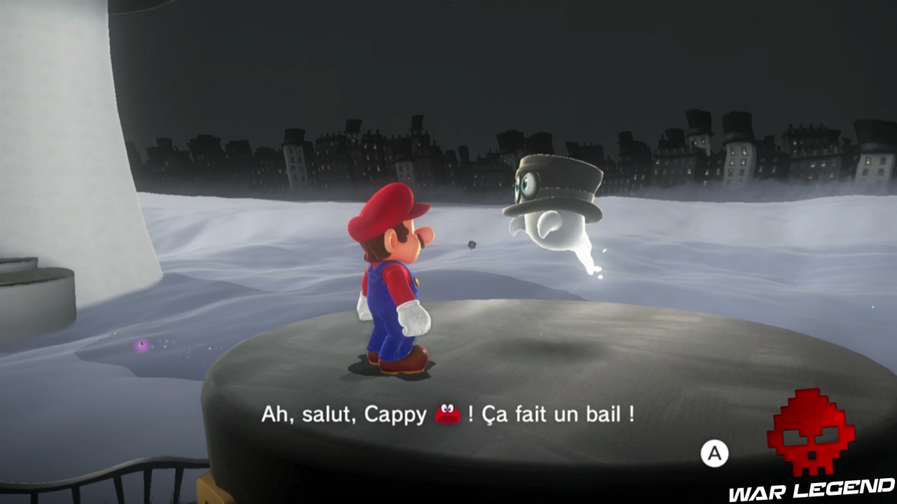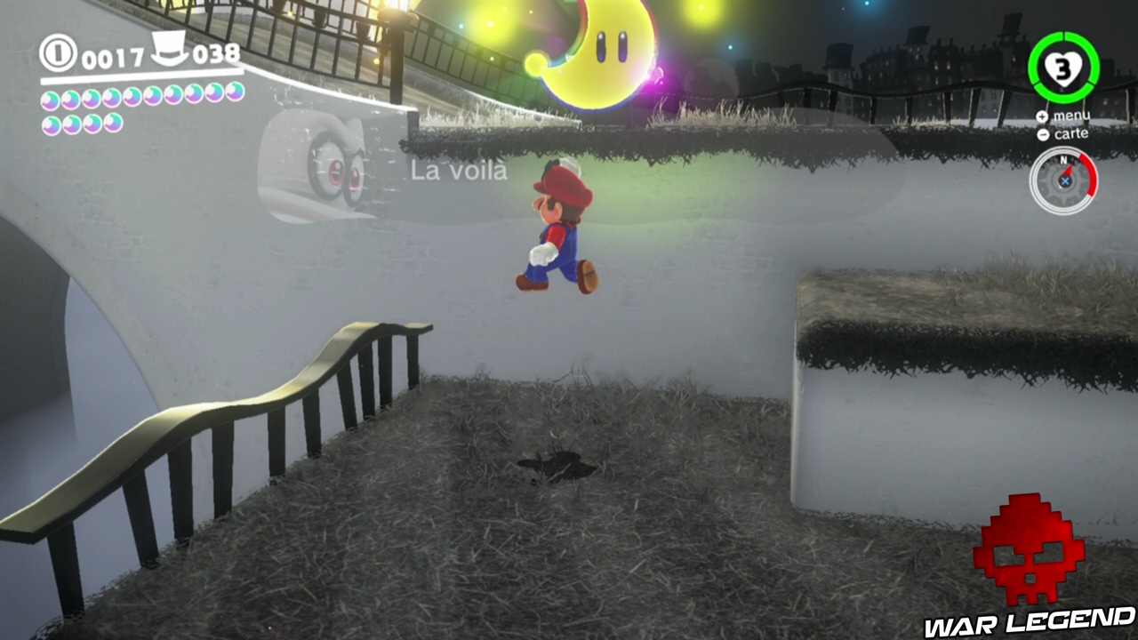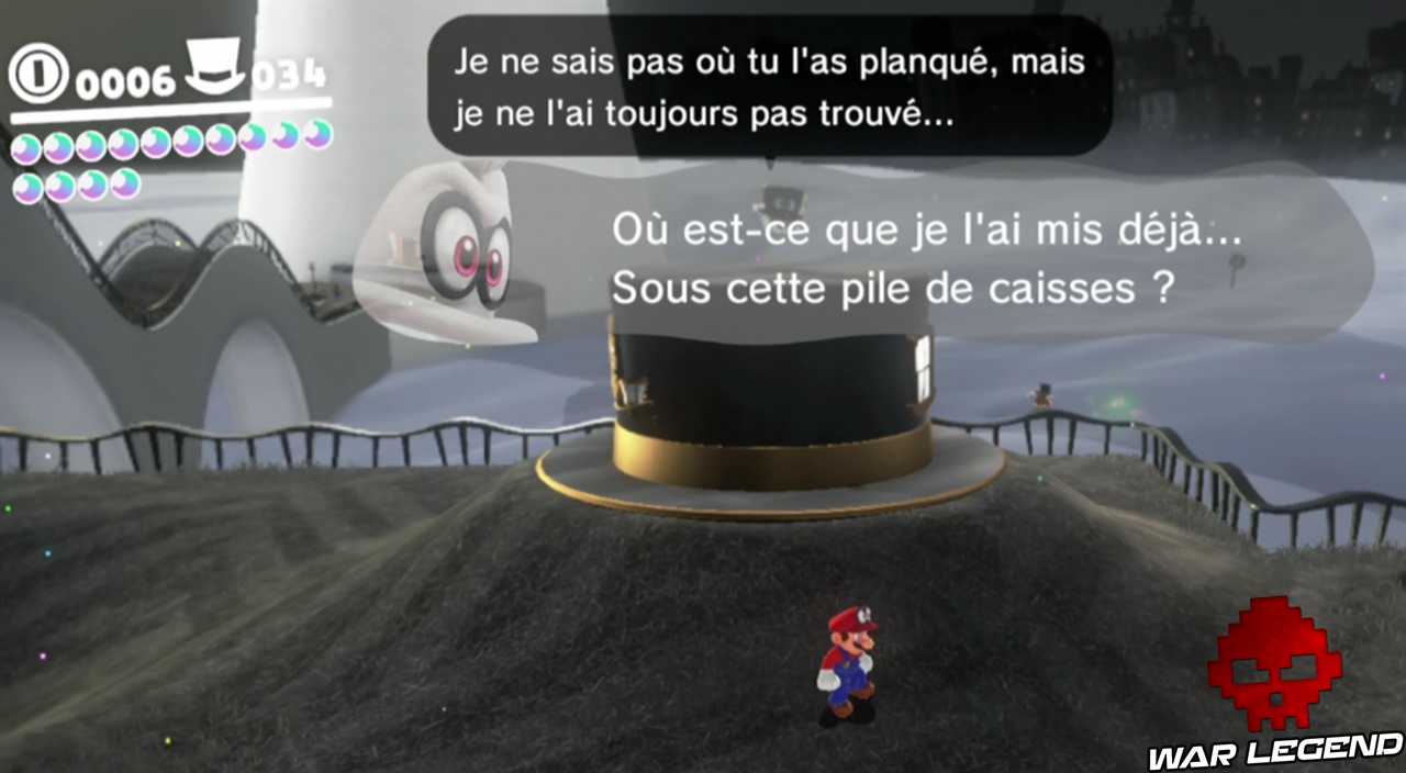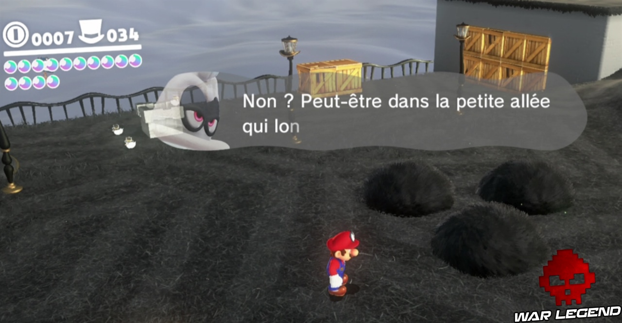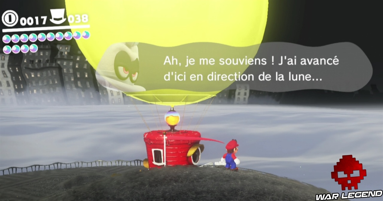 Pour commencer il faut briser les caisses juste à côté de la maison, en plein centre ville. Une fois que vous avez le nouvel indice, vous pouvez vous diriger vers le point suivant. Sur le point 2, c’est en contre bas. Le point 3 est sur le pont, le point 4 est sur la petite montée de terre proche de l’Odyssée, et enfin sur le point 5 il faut faire une charge au sol au bon endroit pour gagner la lune. Voir les captures d’écran ci-dessous pour les emplacements exacts.