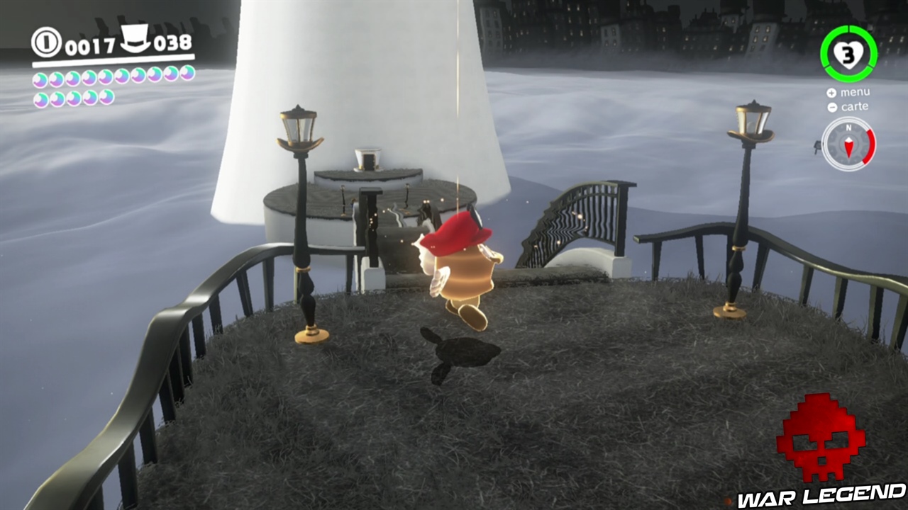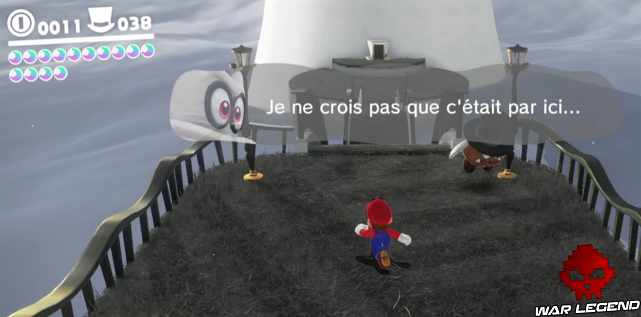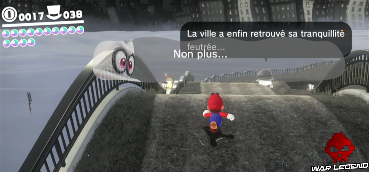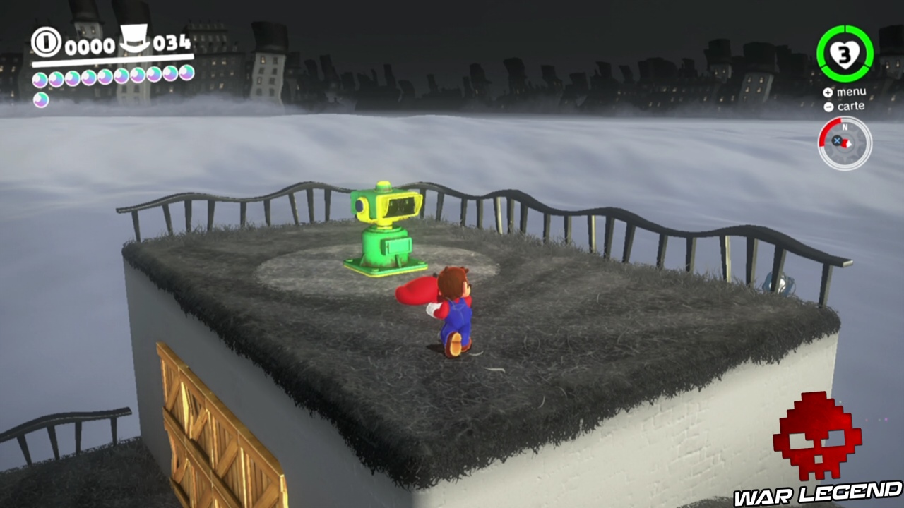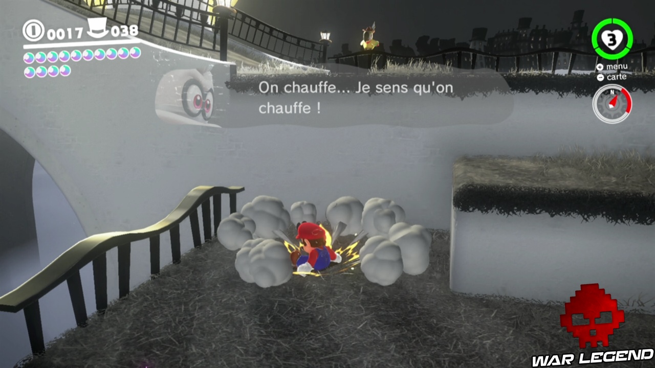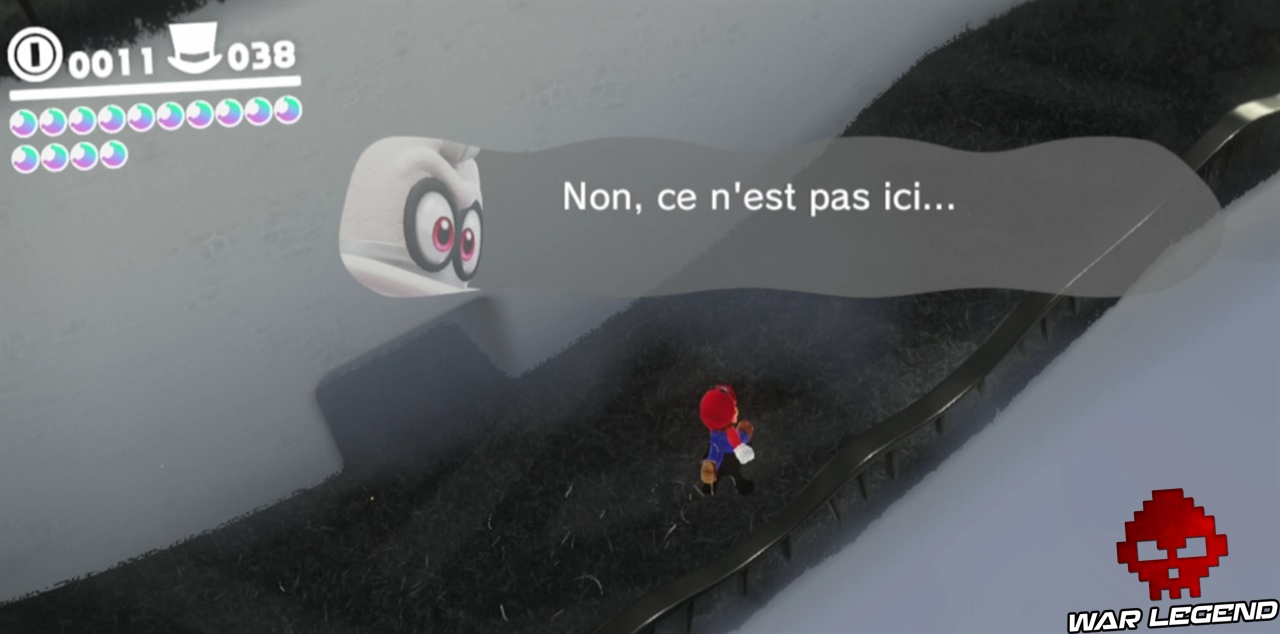 Pour commencer il faut briser les caisses juste à côté de la maison, en plein centre ville. Une fois que vous avez le nouvel indice, vous pouvez vous diriger vers le point suivant. Sur le point 2, c’est en contre bas. Le point 3 est sur le pont, le point 4 est sur la petite montée de terre proche de l’Odyssée, et enfin sur le point 5 il faut faire une charge au sol au bon endroit pour gagner la lune. Voir les captures d’écran ci-dessous pour les emplacements exacts.