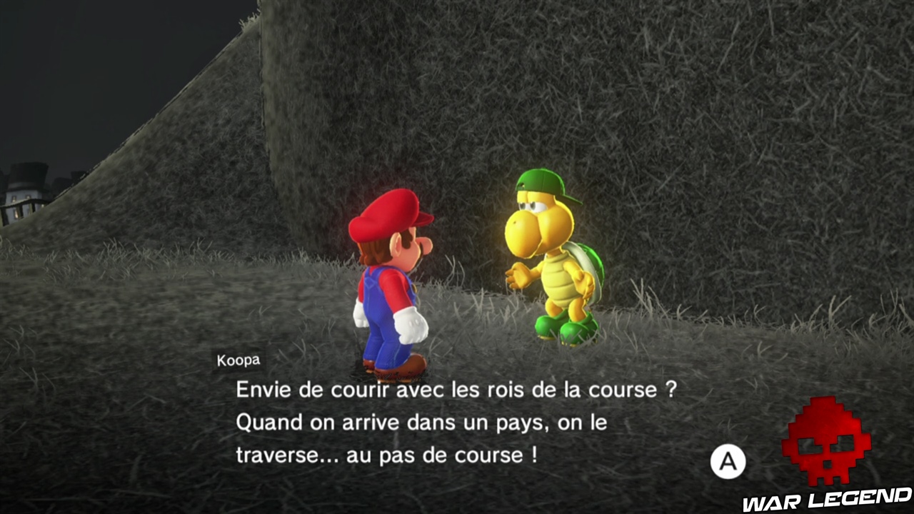 C’est une course qui part du point jaune avec une arrivée proche de l’Odyssée au début du Pays. La première course (standard), n’est pas trop complexe, il faut simplement effectuer des sauts en longueur tout le long et vous arriverez premier. Petite astuce pour gagner du temps, lorsque vous sautez tout en haut vers le pont, faites une charge au sol puis un saut en avant juste avant d’atterrir pour éviter d’être étourdi par la chute.