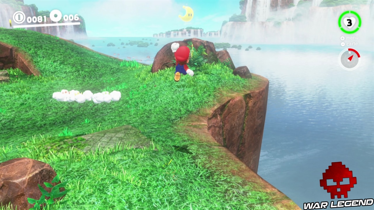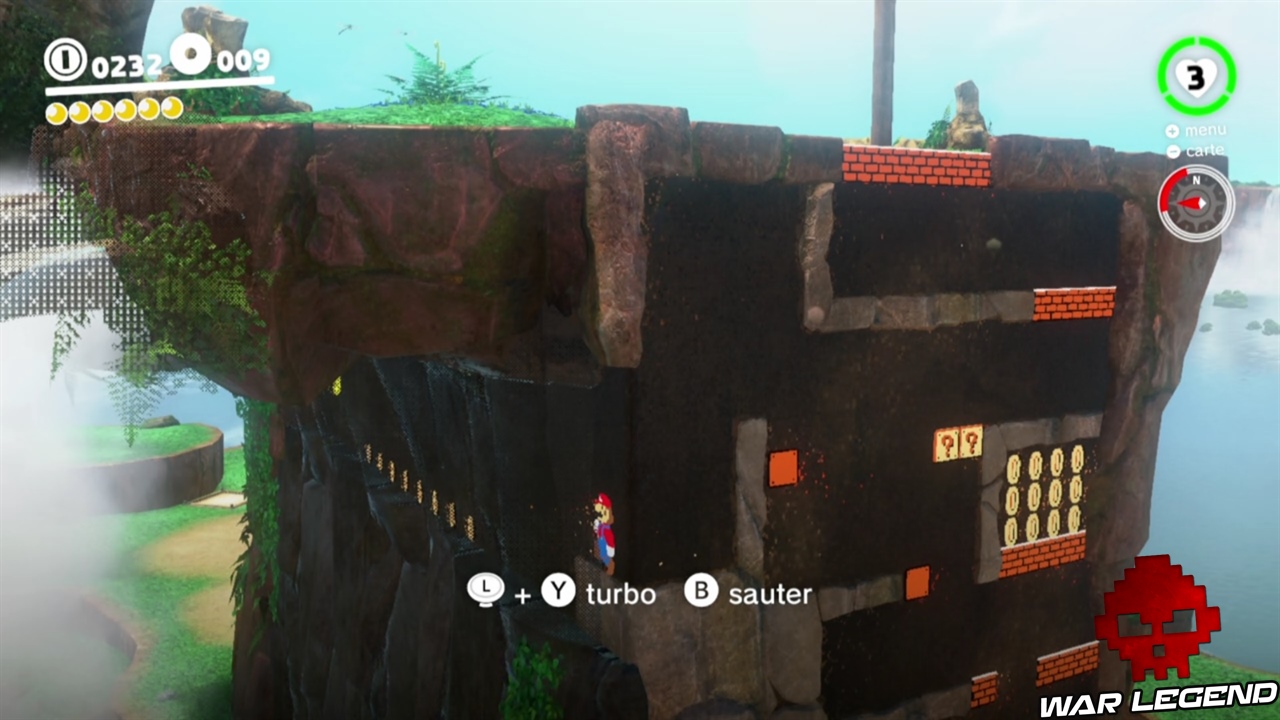 Cette Lune se trouve dans le niveau en 2D qui mène au sommet du Pays. Sur la gauche, sautez sur un bloc invisible pour accéder à un passage secret menant à la façade de la colline sous la cascade contenant des pièces et la lune.