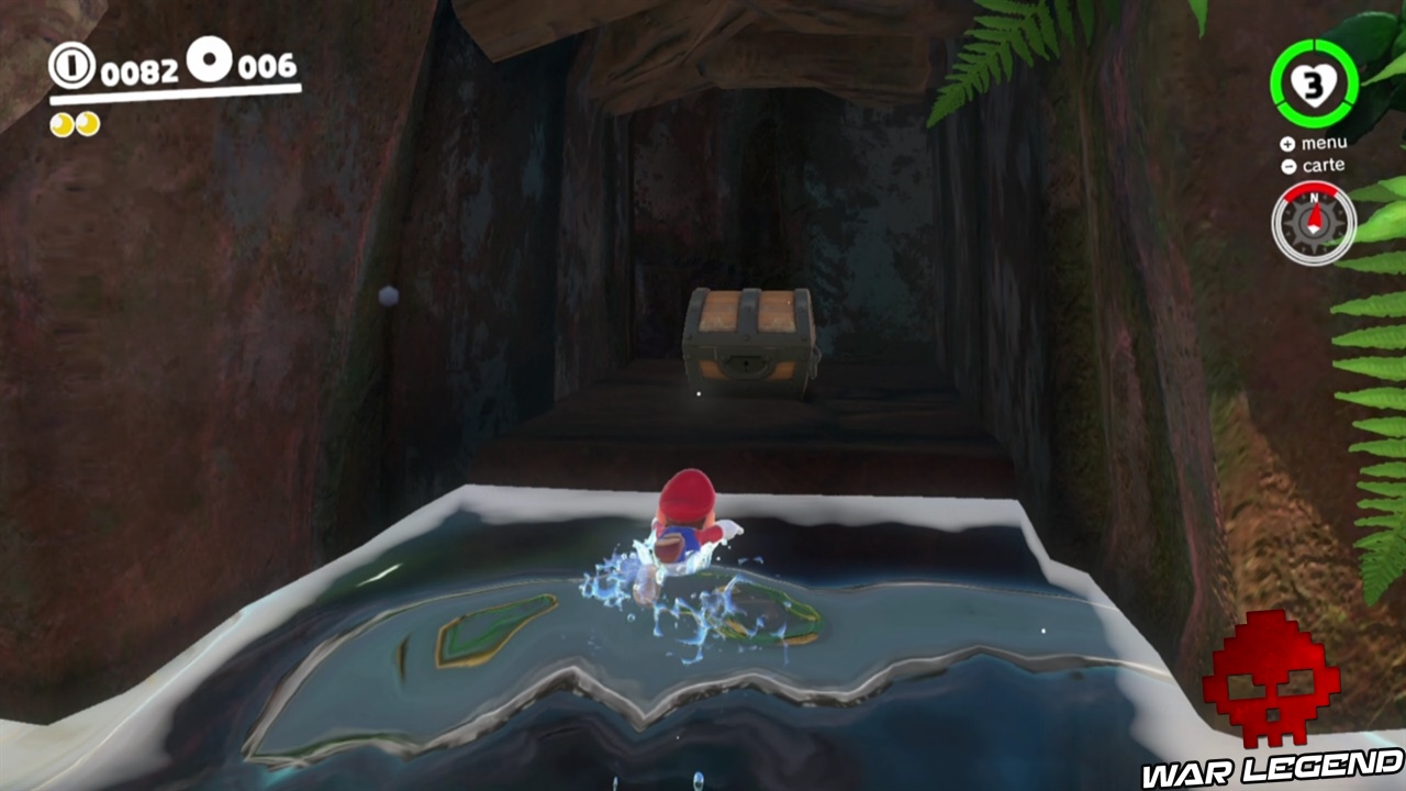 Cette Lune se trouve proche du début de la zone. Avant de prendre le petit pont traversant le point d’eau, plongez et longez le mur pour découvrir une cavité avec un coffre contenant la lune.