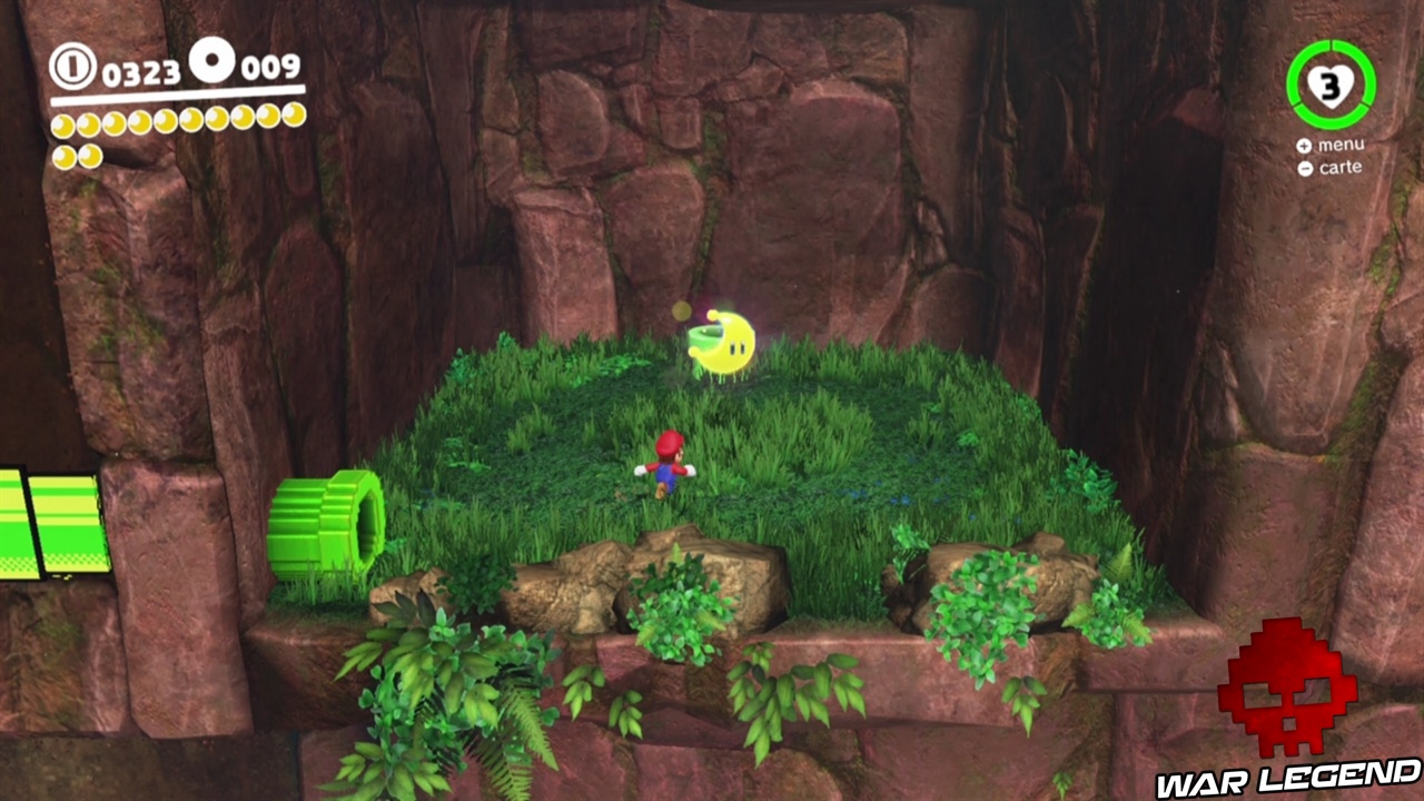 Un niveau se cache dans un tuyau derrière le sommet de la zone. Pour y aller, depuis l’odyssée il suffit de suivre la falaise au nord ouest peu après les 4 Chomps. Dans ce niveau le but du jeu est d’envoyer le chomp dans la cible ! Visez juste comme au billard et cela ne devrez pas poser de problème après quelques essais. Attention ne quittez pas la zone après avoir récupéré cette lune, car la lune numéro 15 est juste à côté !