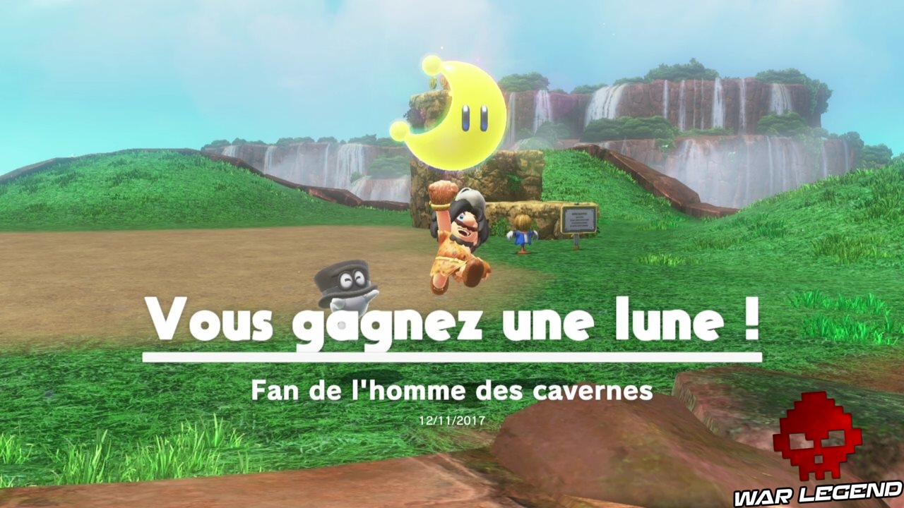 Achetez le costume de l’homme des cavernes avec vos pièces violettes au marchand au début du Pays, changez-vous puis partez au point jaune ci-dessus pour gagner cette lune.