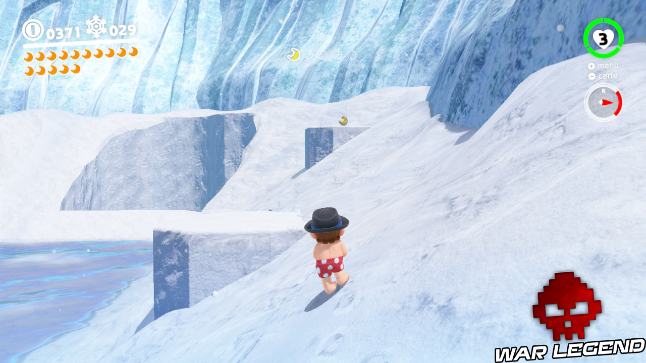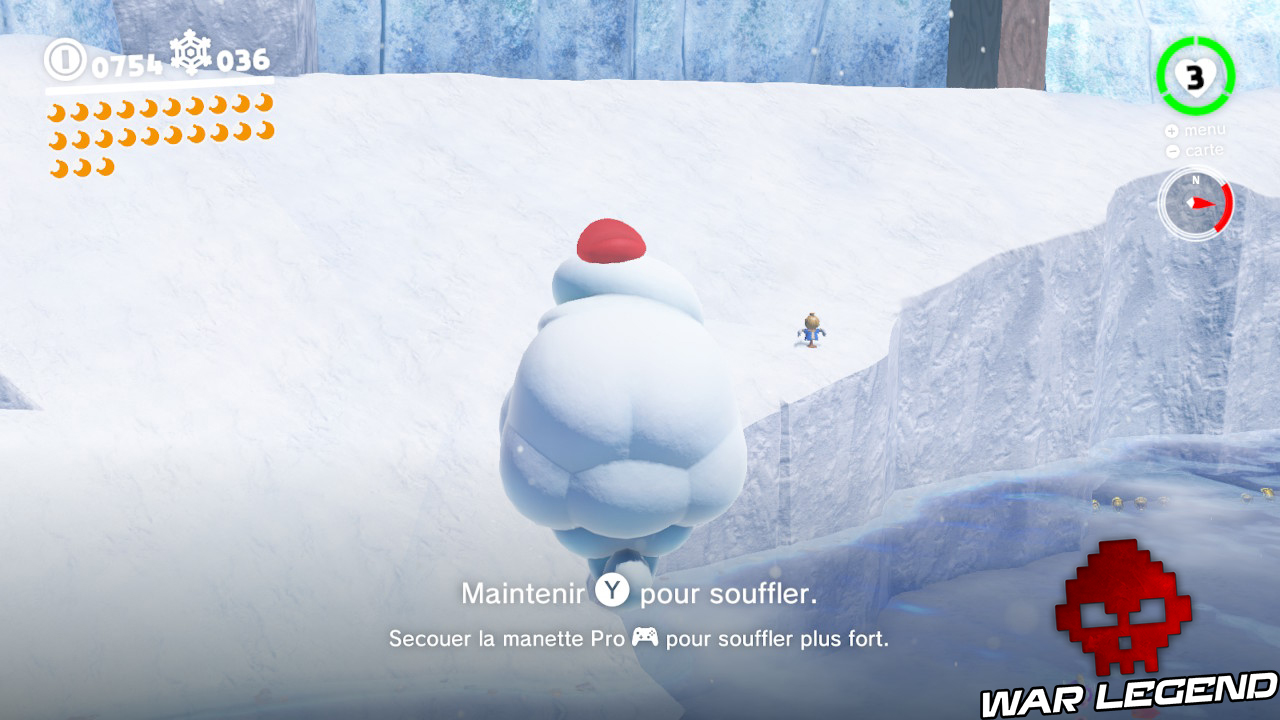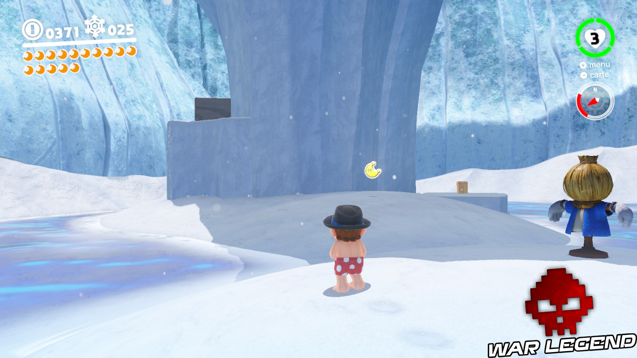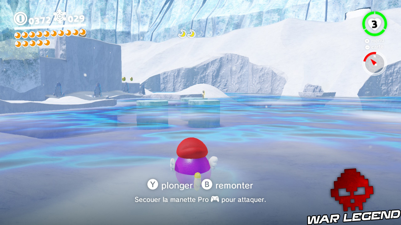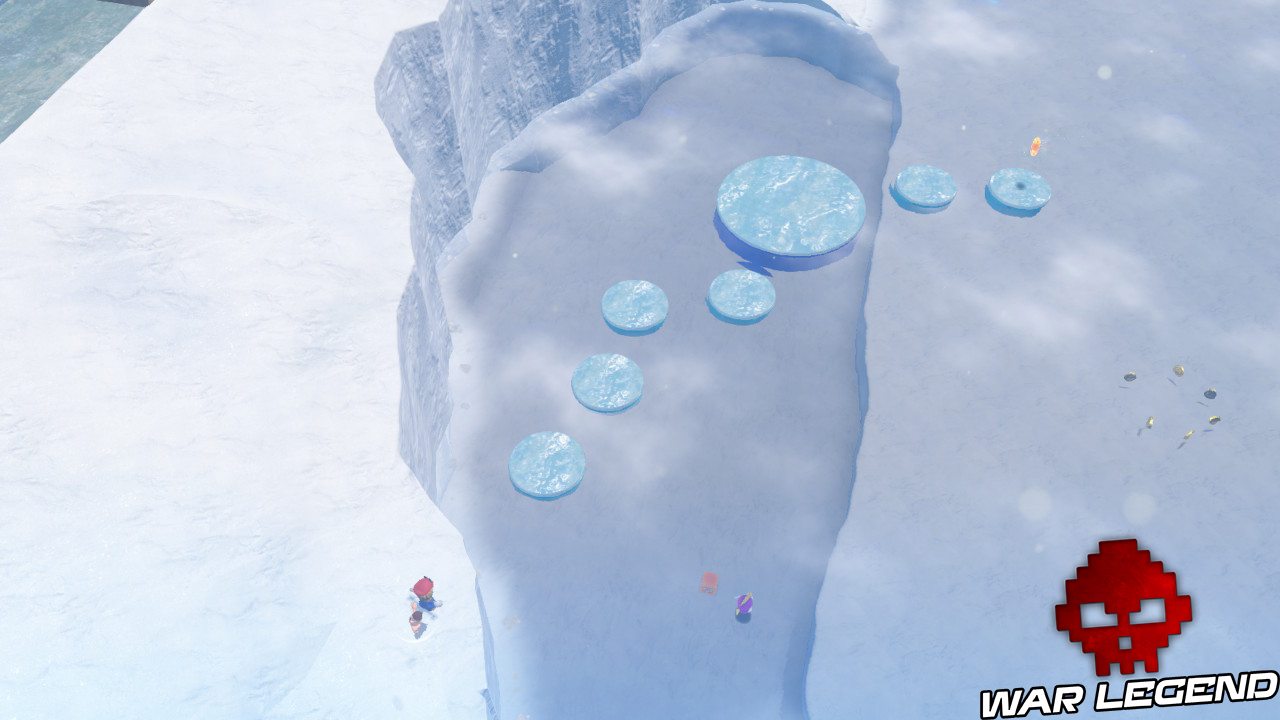 Le long de la paroi neigeuse, vous trouverez un épouvantail bleu qui fait apparaître un parcours de disques glacés dans l’eau lorsque vous lancez Cappy dessus.