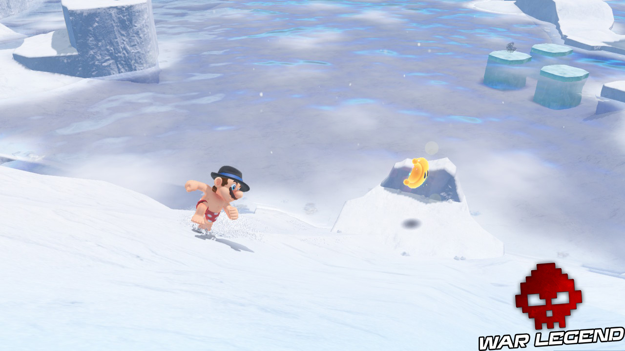 Avancez dans Flocons-en-Flonflonnie jusqu’à apercevoir une plateforme centrale bloquée avec de nombreux habitants autour. Prenez la première entrée sur la droite pour vous retrouver dans une caverne. Chapimorphez-vous en Goomba dès que possible puis sautez sur les autres afin d’atteindre une pile de quatre créatures. Normalement, vous devriez alors vous trouver sur une plateforme où un cercle sombre est dessiné au sol, passez dessus et écartez-vous pour voir une stalactite s’écraser au sol. Sautez dessus puis sur la plaque de pression marquée « 4 ». Vous avez alors accès à une Lune !