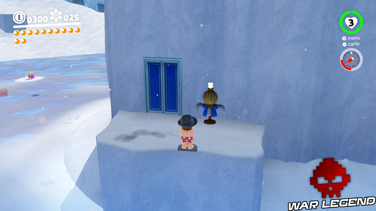 Allez-y et utilisez votre chapeau dessus pour ouvrir la porte. Avancez à travers les blocs d’eau jusqu’à une plateforme plus longue que les autres. Au lieu de passer dans le bloc d’eau dessous, montez dessus et utilisez les barres qui dépassent du mur pour atteindre une Lune dans un bloc d’eau.
