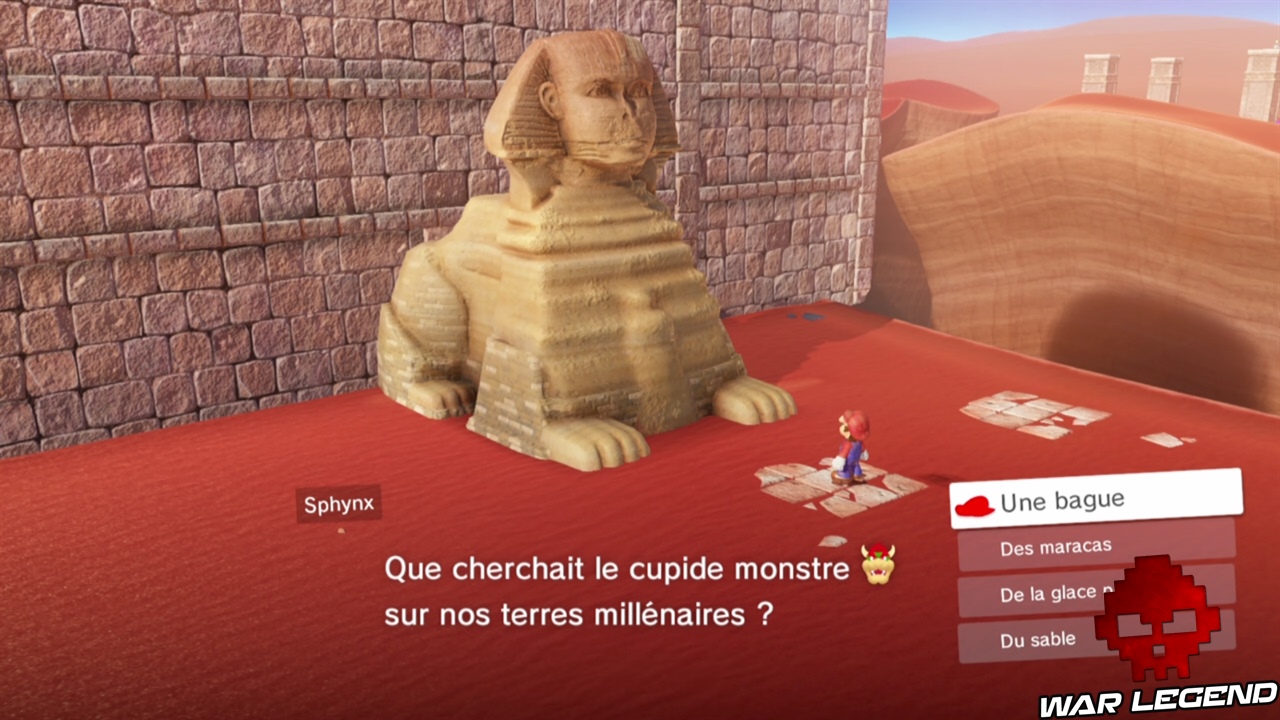 Le sphinx vous attend au point jaune ci-dessus. Parlez-lui et il va vous poser une question, la bonne réponse est « Une bague ». Ensuite, parlez-lui à nouveau pour qu’il vous propose de répondre à une série de questions pour la lune numéro 41. Voici les réponses : 30, la glace, 5, Sphynx.