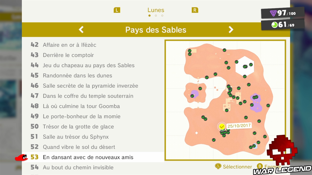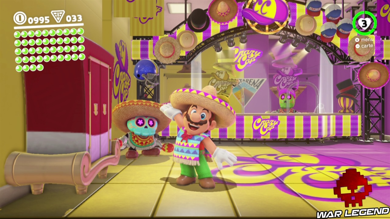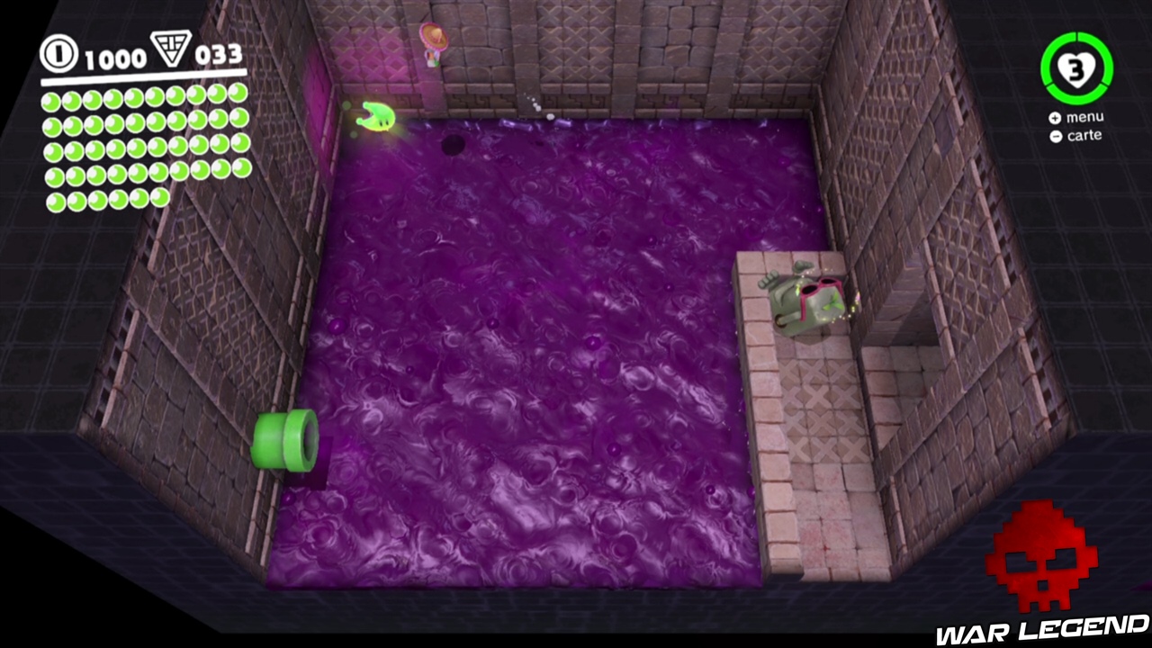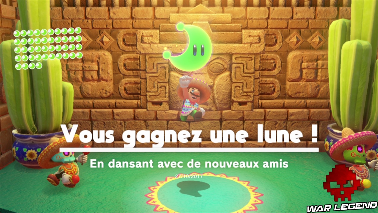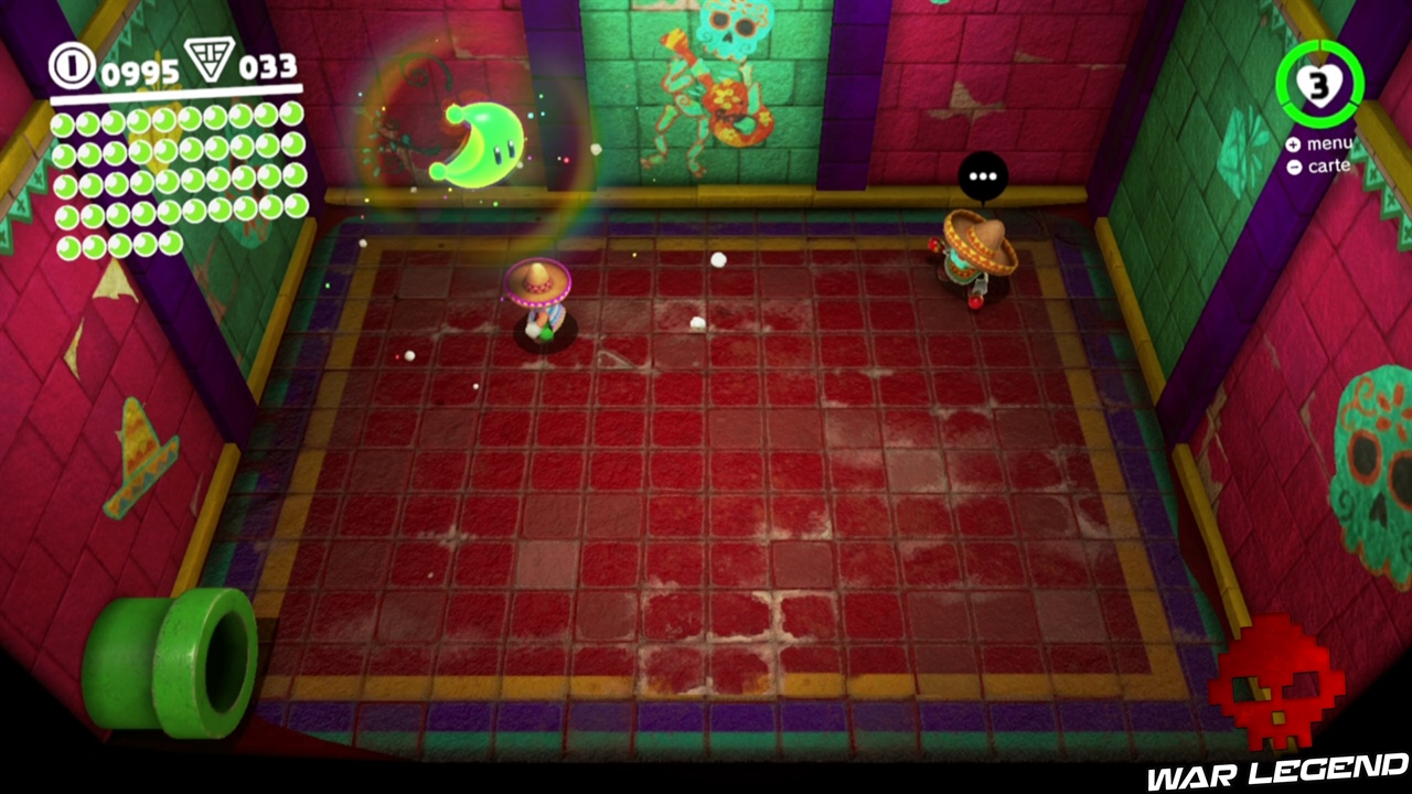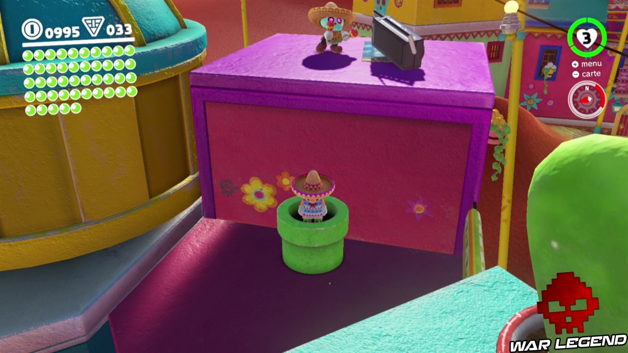 Sur le point jaune de la carte ci-dessus, vous trouverez un niveau à terminer, à la fin de celui-ci se trouve cette lune. Utilisez les ma’tuvu pour détecter les chemins invisibles et vous arriverez à passer sans problème. Notez que la lune numéro 55 est également disponible ici, dans la toute première salle, lancez votre chapeau sur la pancarte à tête de mort, et maintenez la touche pour faire sortir cette deuxième lune.