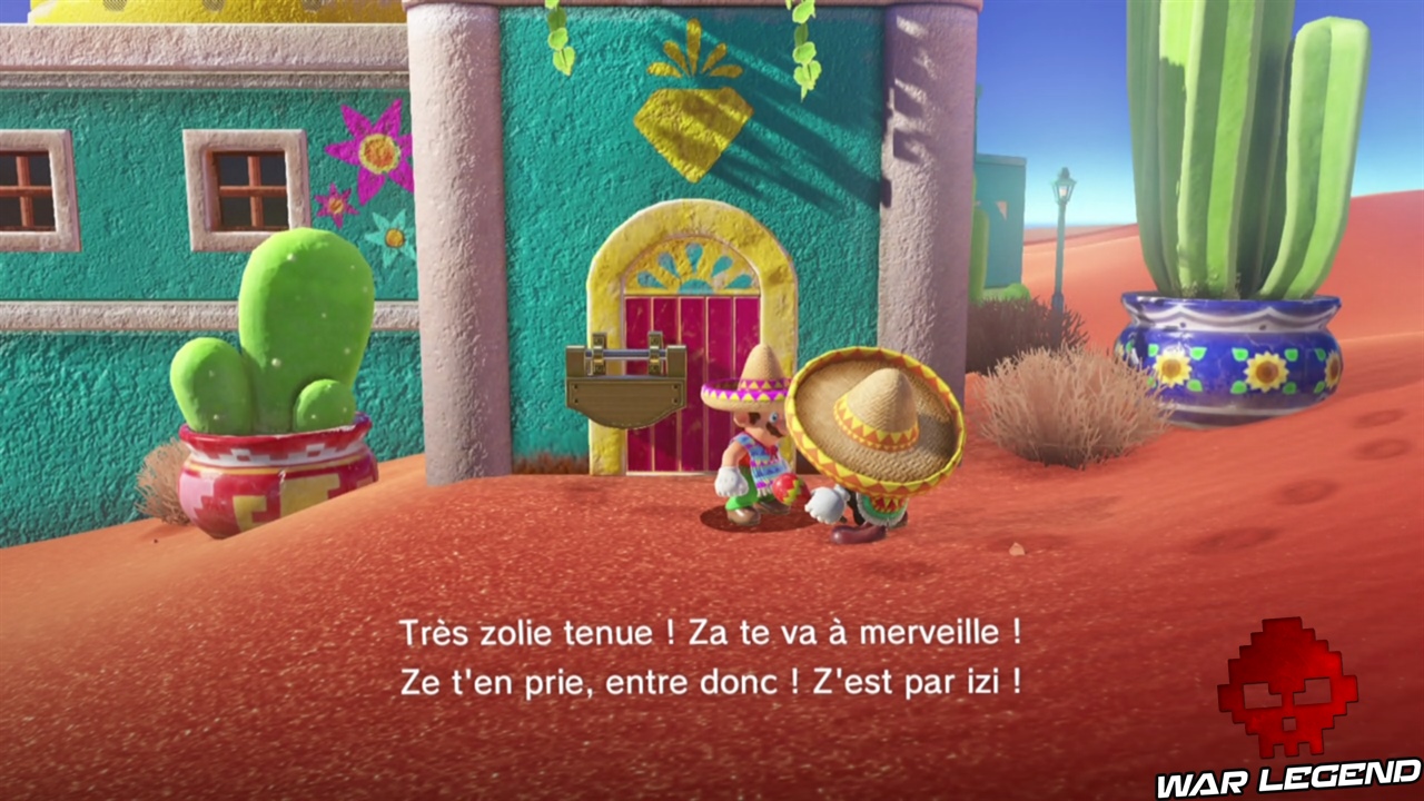 Dans le village des sables, achetez la tenu mexicaine et le chapeau de sombrero, équipez-les, puis rendez-vous au point jaune sur la carte ci-dessus, parlez au personnage, en voyant votre déguisement, il va débloquer la porte. Rentrez dans la maison, positionnez-vous sur l’estrade pour jouer quelques notes de musiques avec ces amis pour qu’ils vous donnent la lune en remerciement.