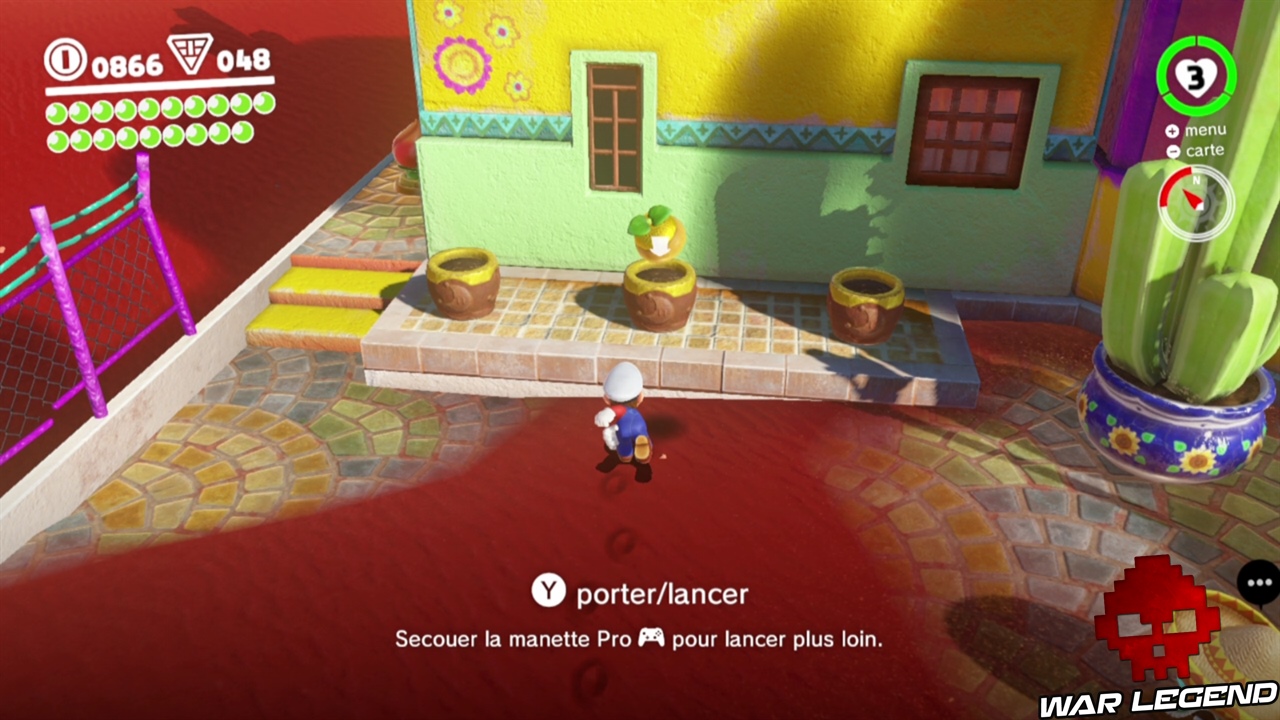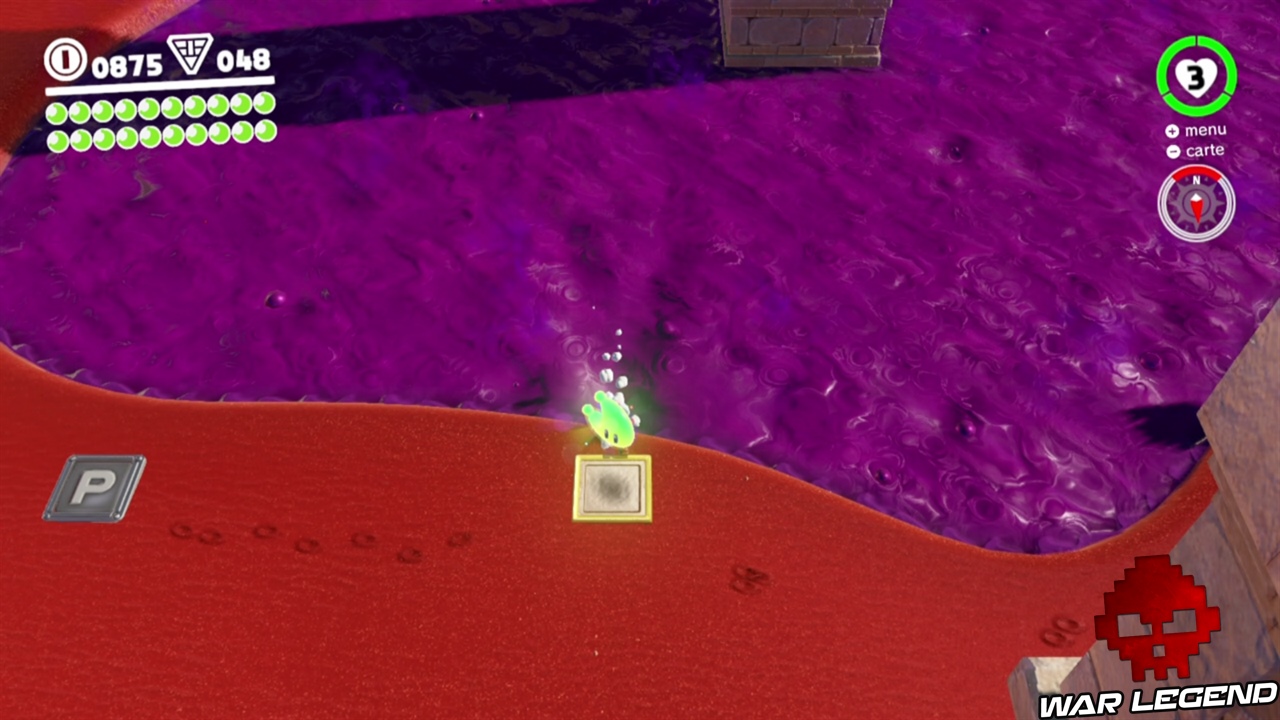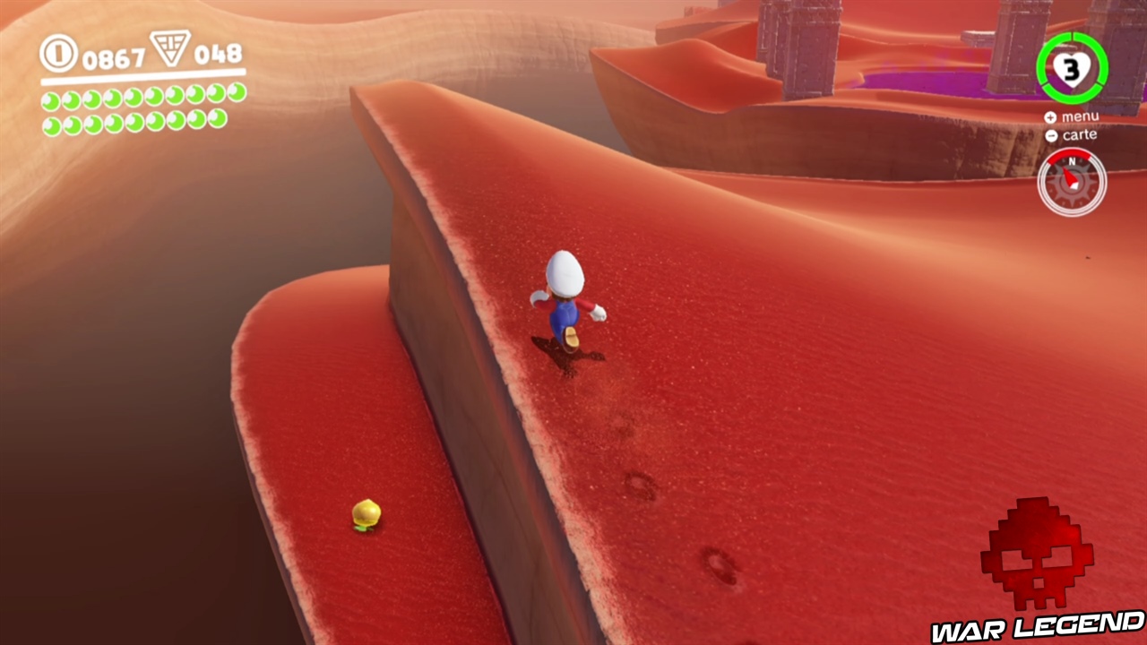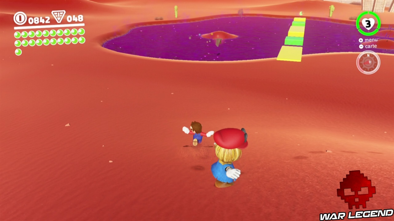 Encore un mini jeu de rapidité avec un épouvantail qui se trouve à l’extrémité est de la carte, voir le plus jaune ci-dessus. Celui-là n’est pas simple, il faut utiliser le saut en longueur ou le triple saut pour y arriver. Sinon, vous pouvez gruger un peu en allant chercher le Jaxi à la ville des sables, en effet celui-ci peut courir sur le poison sans mourir ! Easy win.