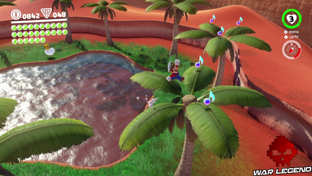 Un peu plus dur comme lune à récupérer, il va falloir être habile du maniement de Mario ! Du côté de l’oasis en bas à droite de la carte. Grimpez sur le palmier qui a une note de musique, ensuite il faut récupérer les différentes notes de musique à proximité, le tout dans un temps imparti.