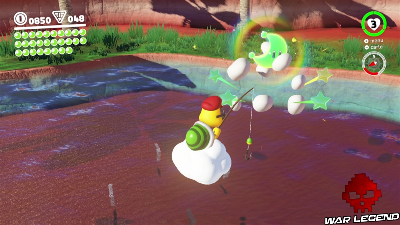 Dans l’oasis en bas à droite du Pays, prenez possession de Lakita le koopa pécheur et vous devez pécher le poisson plus gros que les autres. Il faut tirer la ligne au moment ou le poisson se rapproche, ensuite il faut secouer la manette.