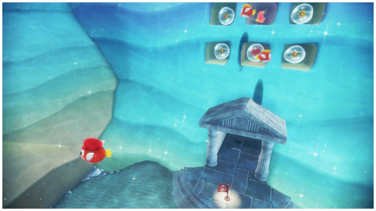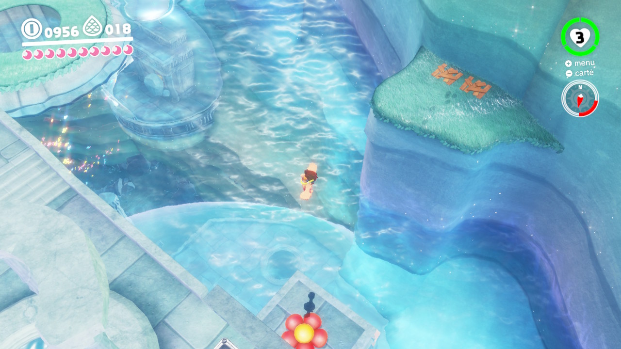 Utilisez la fleur au ras de l’eau pour atteindre la plateforme. Une fois la caisse cassée, celle-ci libèrera la lune.