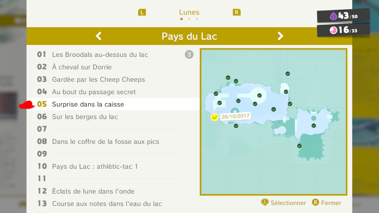 Merci pour ce travail!! Pour la lune 23, pays du lac, il y a des blocs qui font un chemin, pour les faire apparaitre il faut se mettre au bout du T et lancer cappy en secouant les joycons vers l'avant, ce qui devient bien plus simple ;)