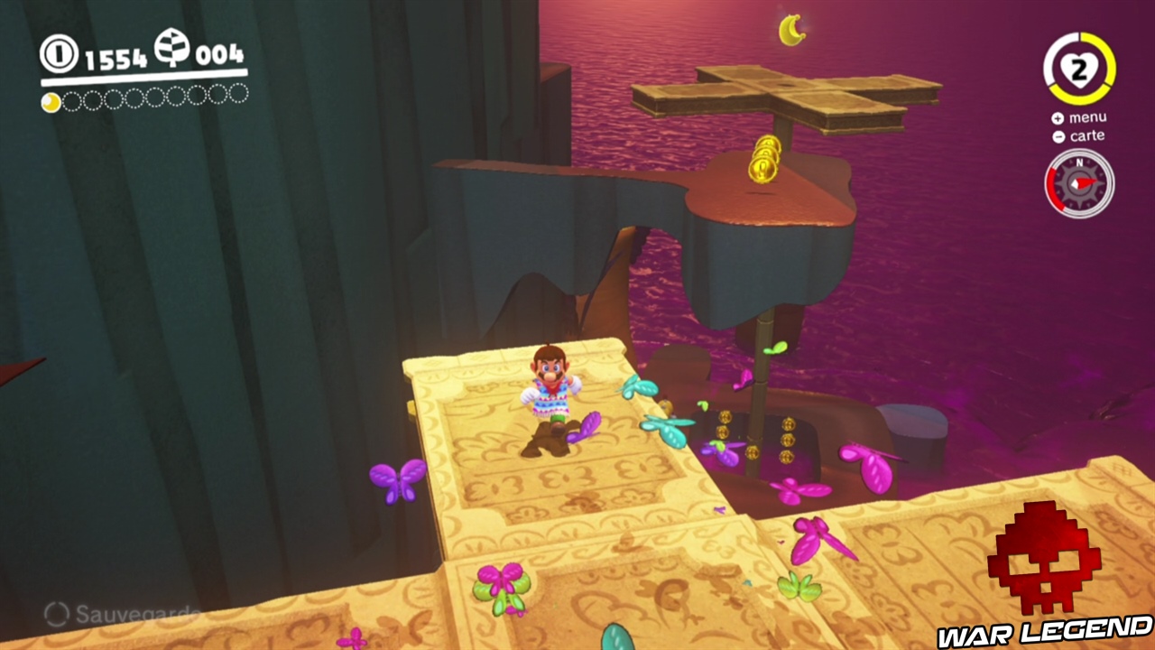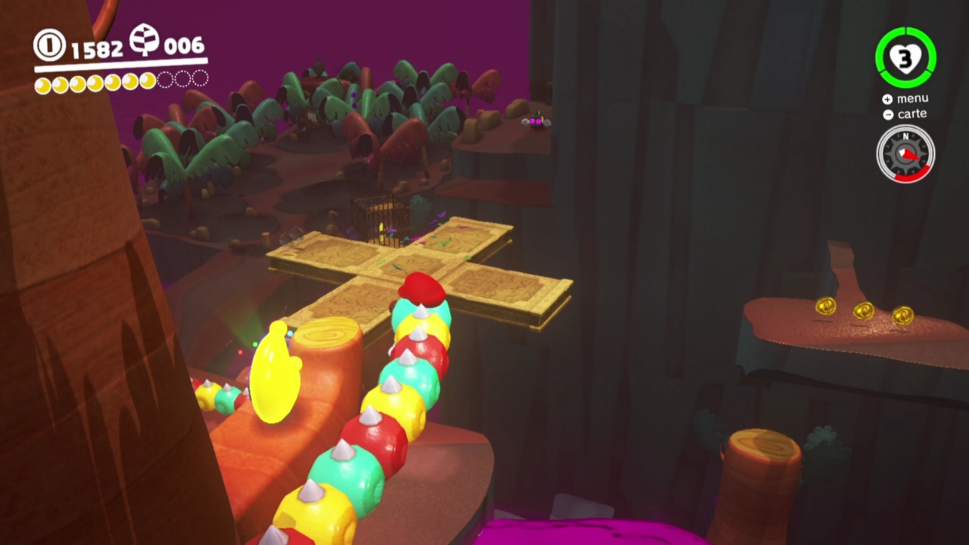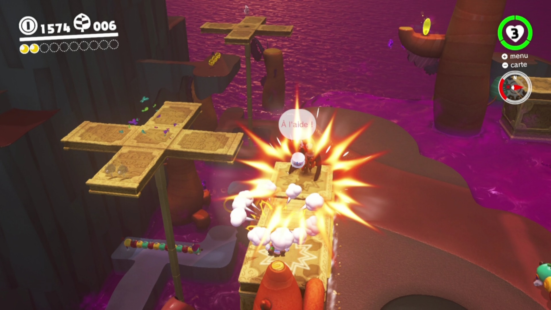 Très rapidement dans ce niveau, un aigle va venir vous voler votre chapeau, et sans chapeau, vous ne pouvez rien faire ! Inutile donc de chercher à explorer ou ramasser des lunes, tant que vous n’avez pas repris votre chapeau. Pour cela, une chose importante à savoir, c’est que les plateformes avec le signe d’explosion blanc peuvent être abaissées en effectuant une charge au sol ! C’est comme ça que vous allez pouvoir grimper jusqu’à l’aigle, et c’est également comme ça que vous pouvez l’assommer et récupérer votre chapeau.