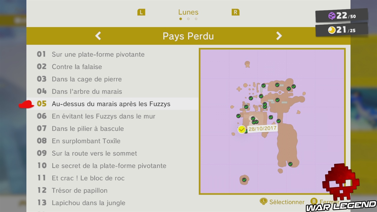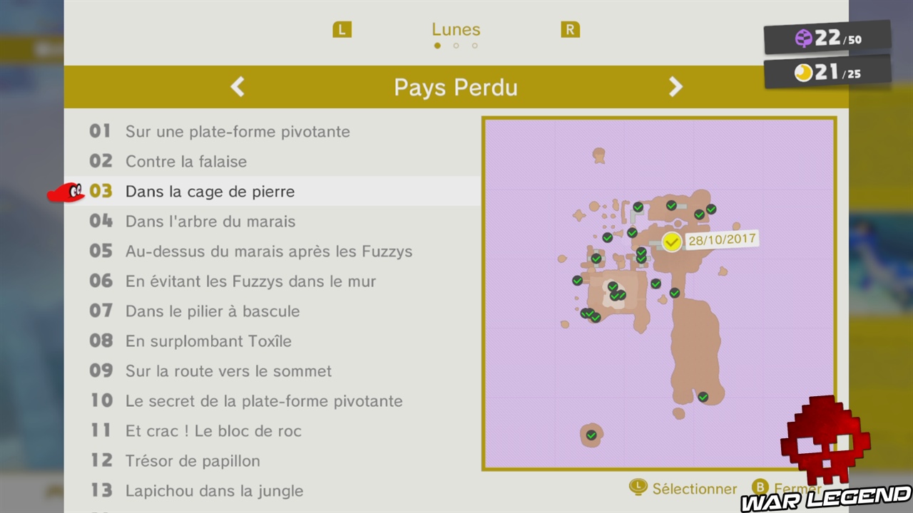 Pour trouver cette lune, il faut faire une charge au sol sur le rocher avec un sigle d’explosion blanc au sol, depuis l’endroit ou l’aigle qui vous a volé le chapeau au début de la zone vous narguait. Cela va descendre le rocher, pour dévoiler une cavité contenant cette lune.