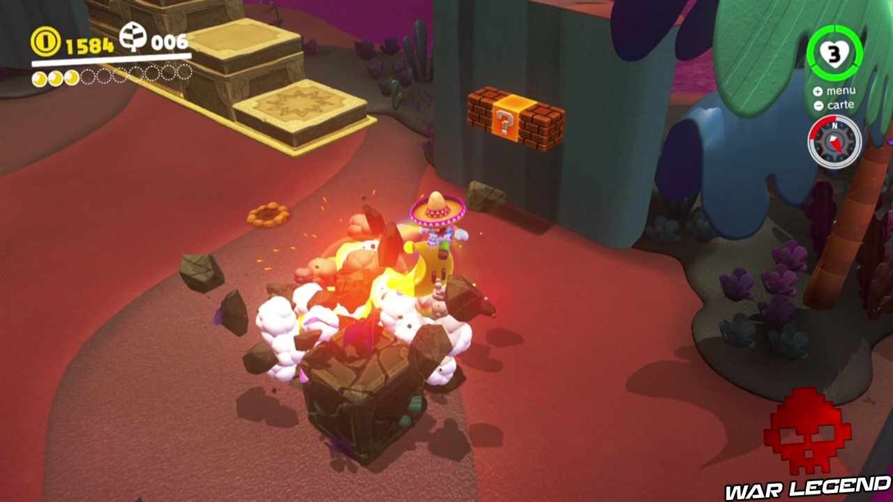 Sur le point jaune ci-dessus, il y a un rocher qui brille. Vous pouvez le casser par une explosion. Pour cela, jetez votre chapeau sur le Raflard puis positionnez-vous sur le rocher, pour qu’il fonce dedans et le fasse exploser.