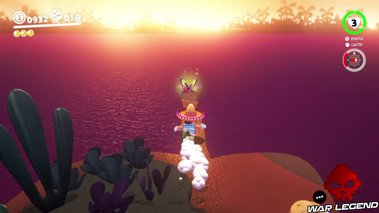 Depuis le sommet, sautez un étage plus bas en direction du point jaune, vous y verrez une sorte de plongeoir, avec au bout un papillon lumineux. Courez-lui dessus et jetez-lui votre chapeau afin de récupérer cette lune.