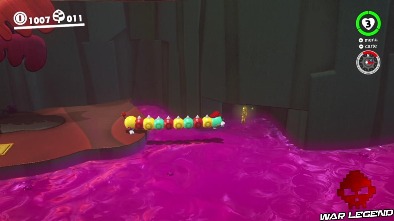 Sur le point jaune ci-dessus, regardez en l’air et vous verrez une cage enfermant une lune. Il faut y jeter un rafflard dedans pour libérer la lune. Le rafflard se trouve de l’autre côté au nord. Jetez-lui votre chapeau puis positionnez-vous de manière à ce qu’il fonce dans la cage. Ensuite retournez sur la plateforme du rafflard pour récupérer un Fuzzy avec lequel vous allez tranquillement pouvoir vous étendre pour ramasser sur cette lune.