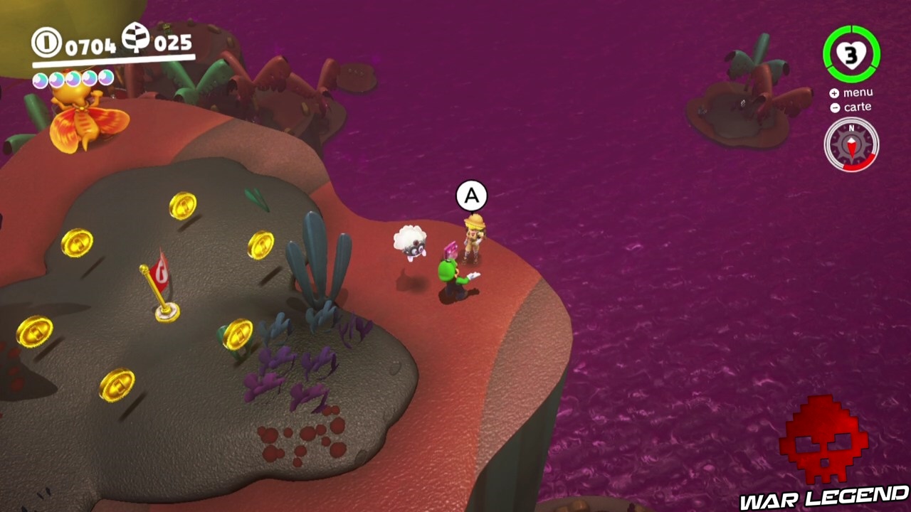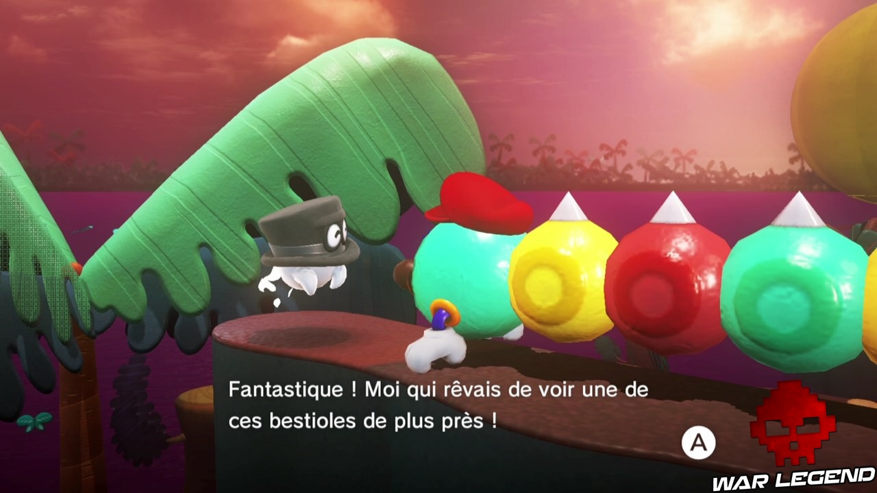 Cette lune se gagne en chapimorphosant un wiggler tropical, puis il faut l’emmener au point jaune de la carte ci-dessus, sur le chapiforme en haut d’un mur. Pour réussir à l’y emmener, il faut placer le wiggler au bout de la plate-forme avec l’icône de charge au sol, redevenez mario, faites une charge au sol de l’autre côté, afin de faire monter le wiggler. Reprenez vite le wiggler et emmenez le face au chapiforme.