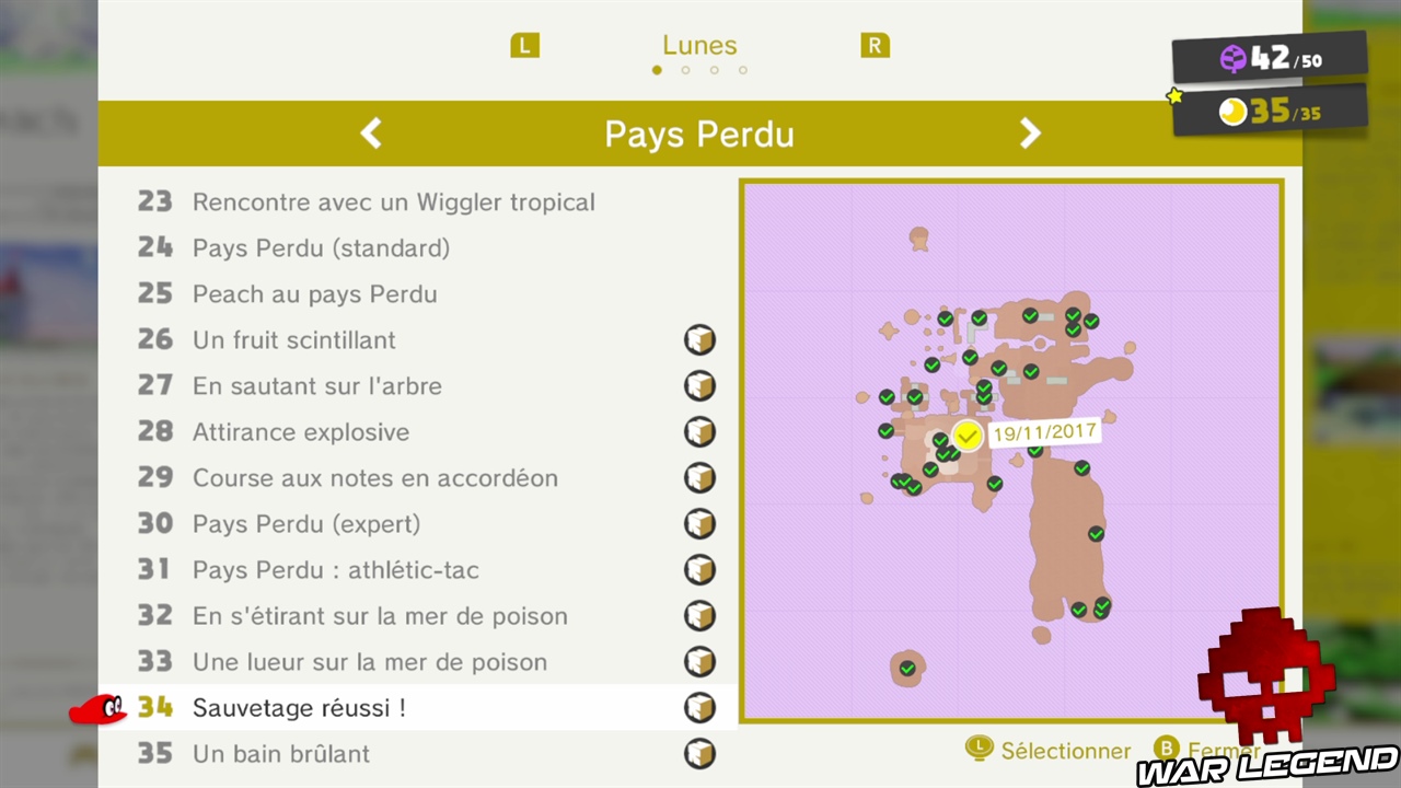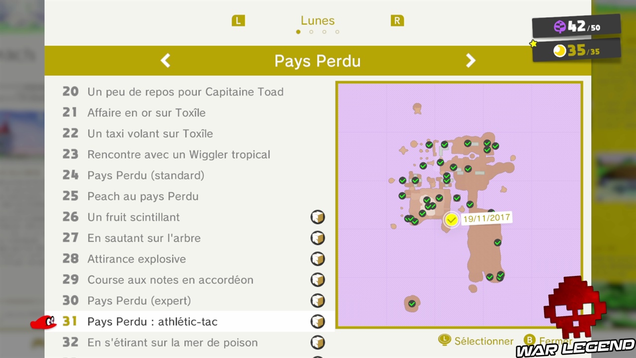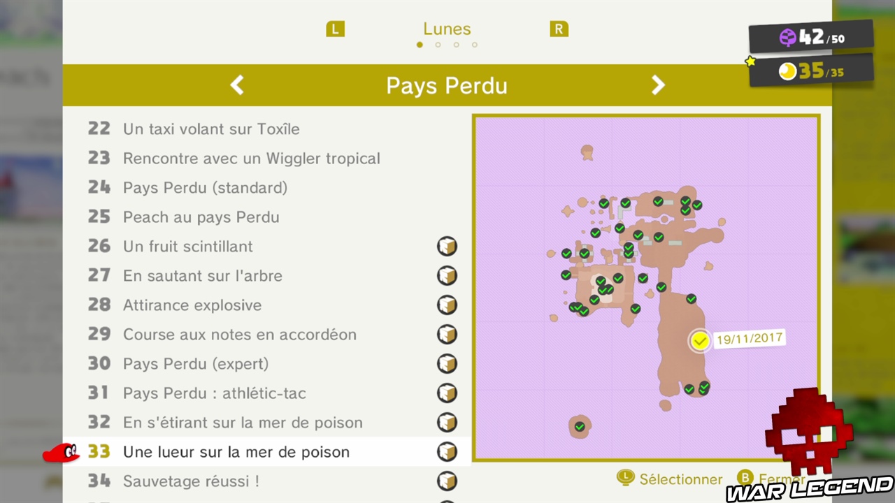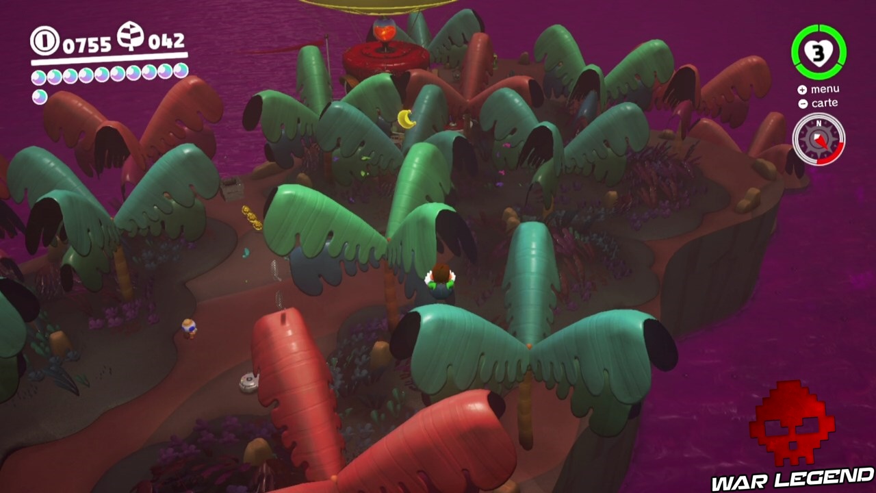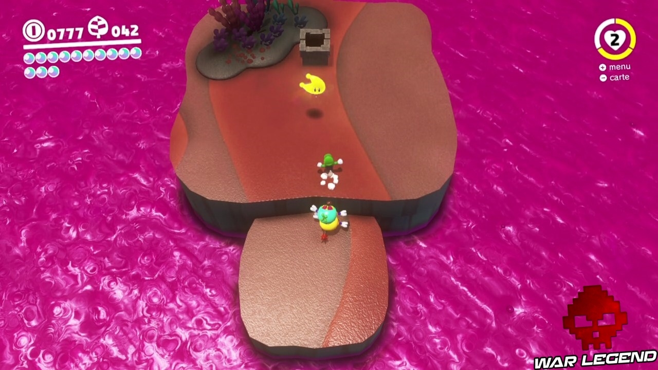 La mer de poison est un tuyau lunaire qui se situe au point jaune ci-dessus. Comme toujours ce type de niveau renferme deux lunes. La première, la 32, est à la fin du niveau. Rien de compliqué à la récupérer.
