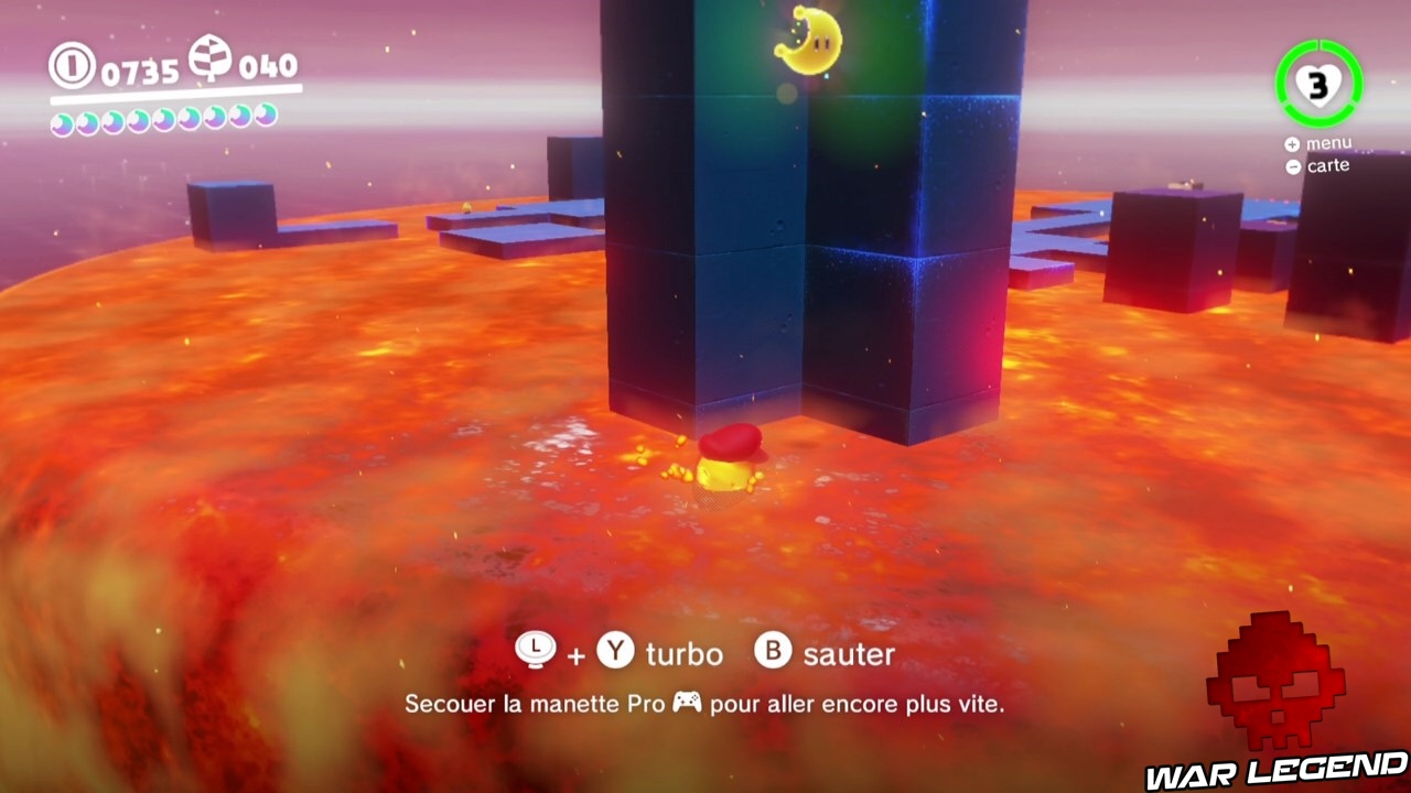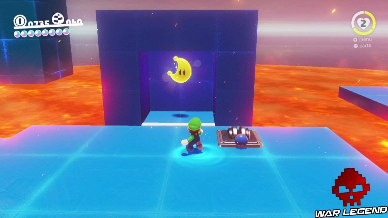 Cette lune se récupère en allumant les deux chaudrons comme sur la capture d’écran ci-dessous. Pour cela orientez Mario de façon à ce que les boules de feu atteignent les chaudrons.