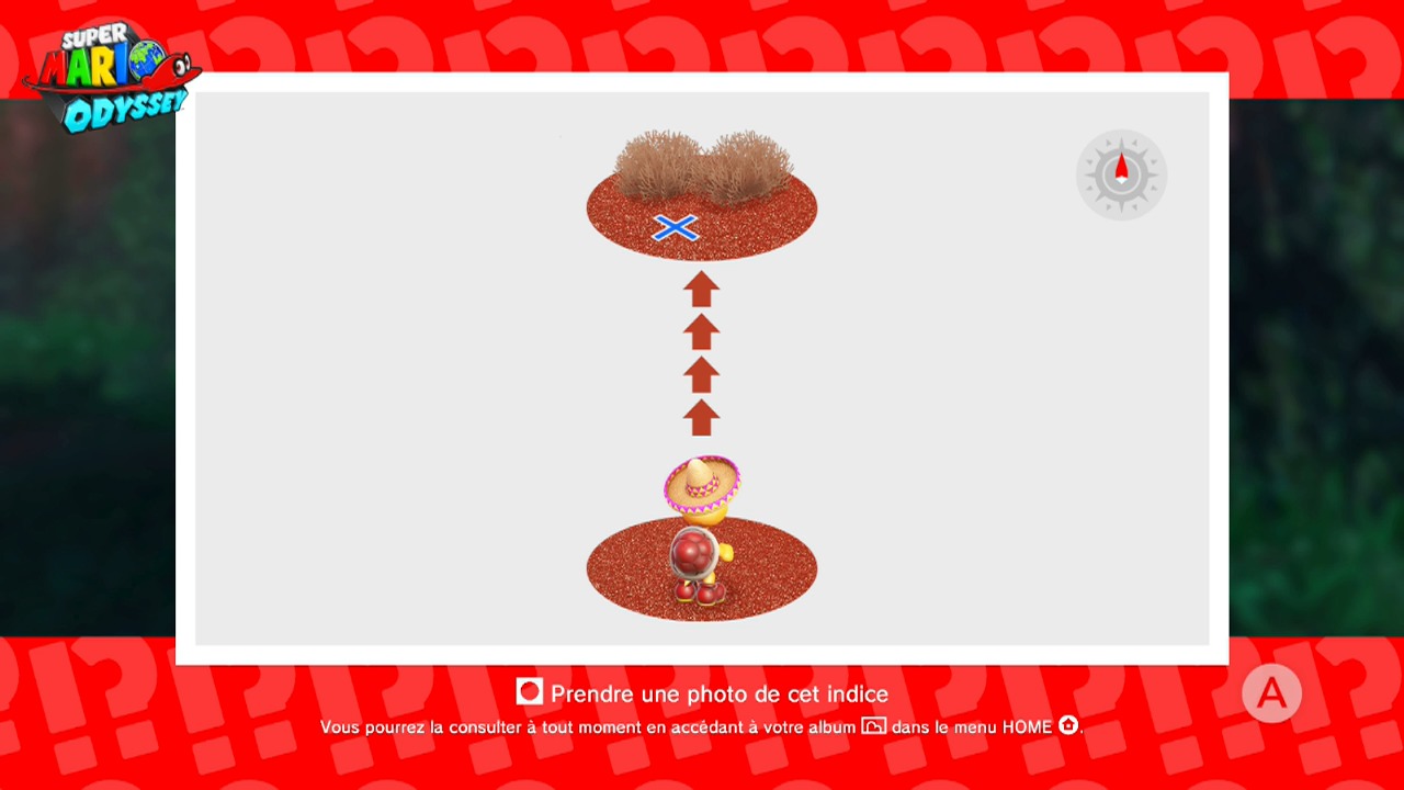 Dans le pays des sables, repérez le Koopa qui vous propose le défi du cercle. À partir de lui, partez plein nord, toujours vers le nord. Dépassez le trou qui mène sous la pyramide et les deux buissons de l’indice se trouveront au bord du précipice.