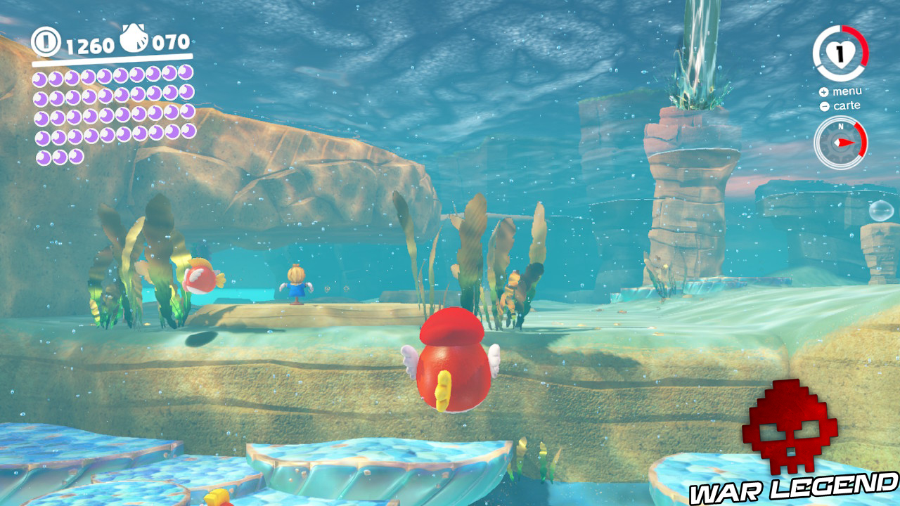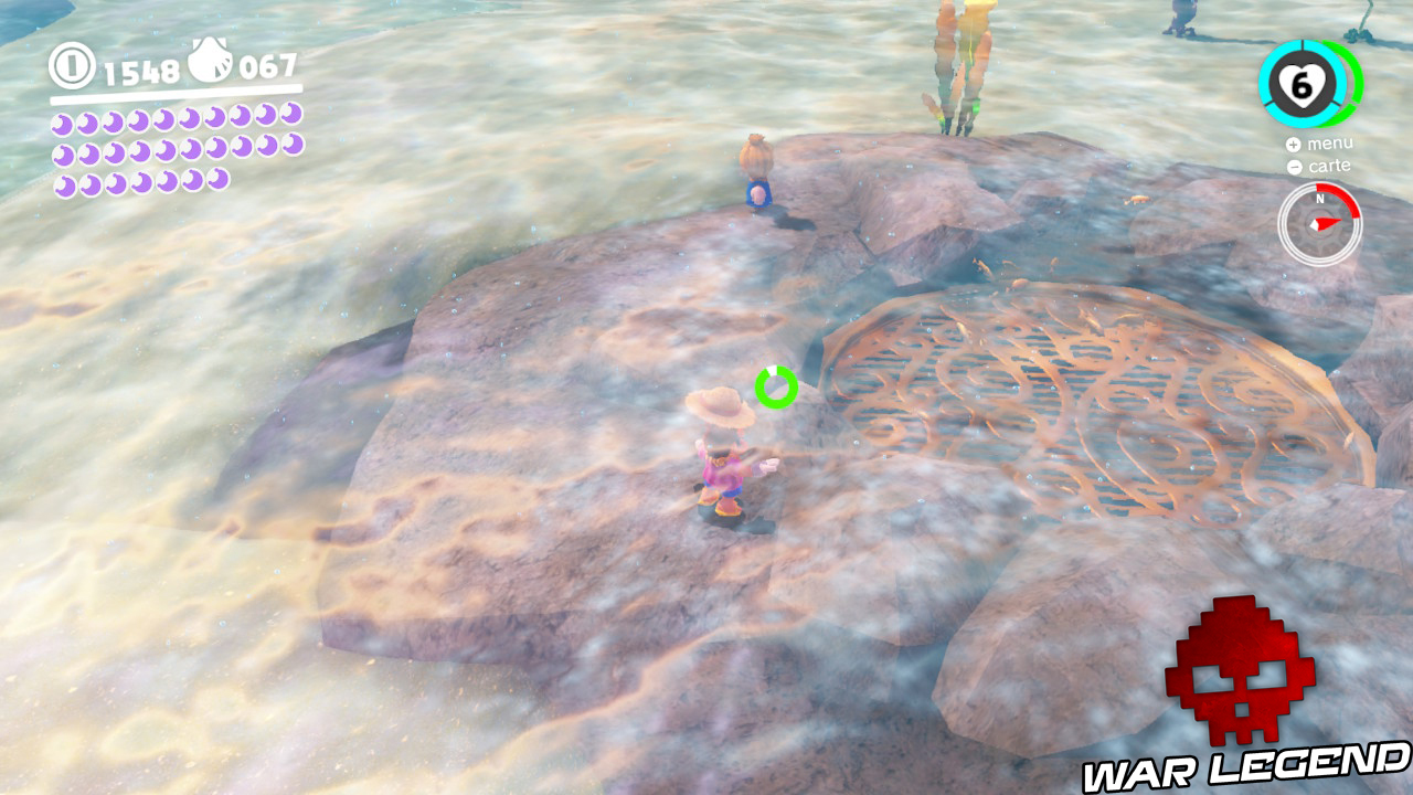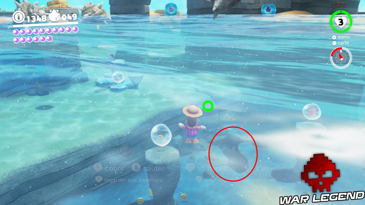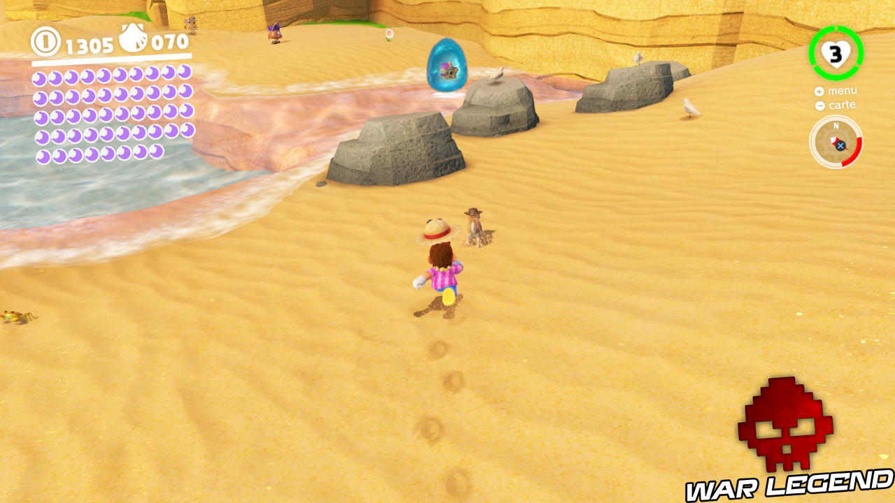 À l’extrémité est de la plage, en partant derrière l’Odyssée, vous trouverez dans l’eau un cratère avec une grille dorée. Utilisez Cappy sur l’épouvantail bleu à proximité et descndez récupérer cinq éclats de Lune.