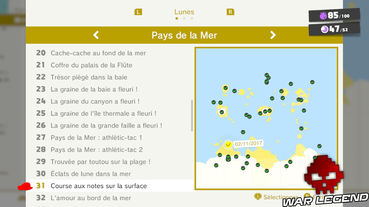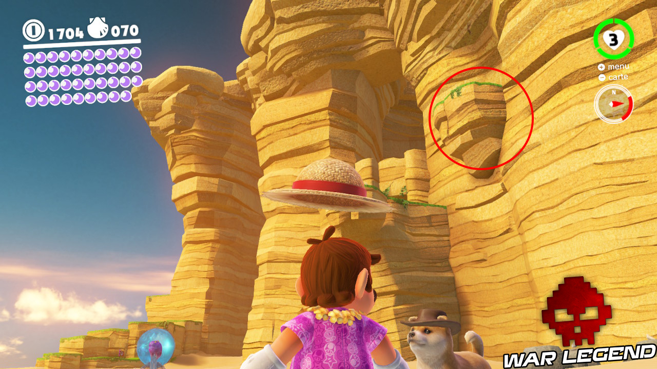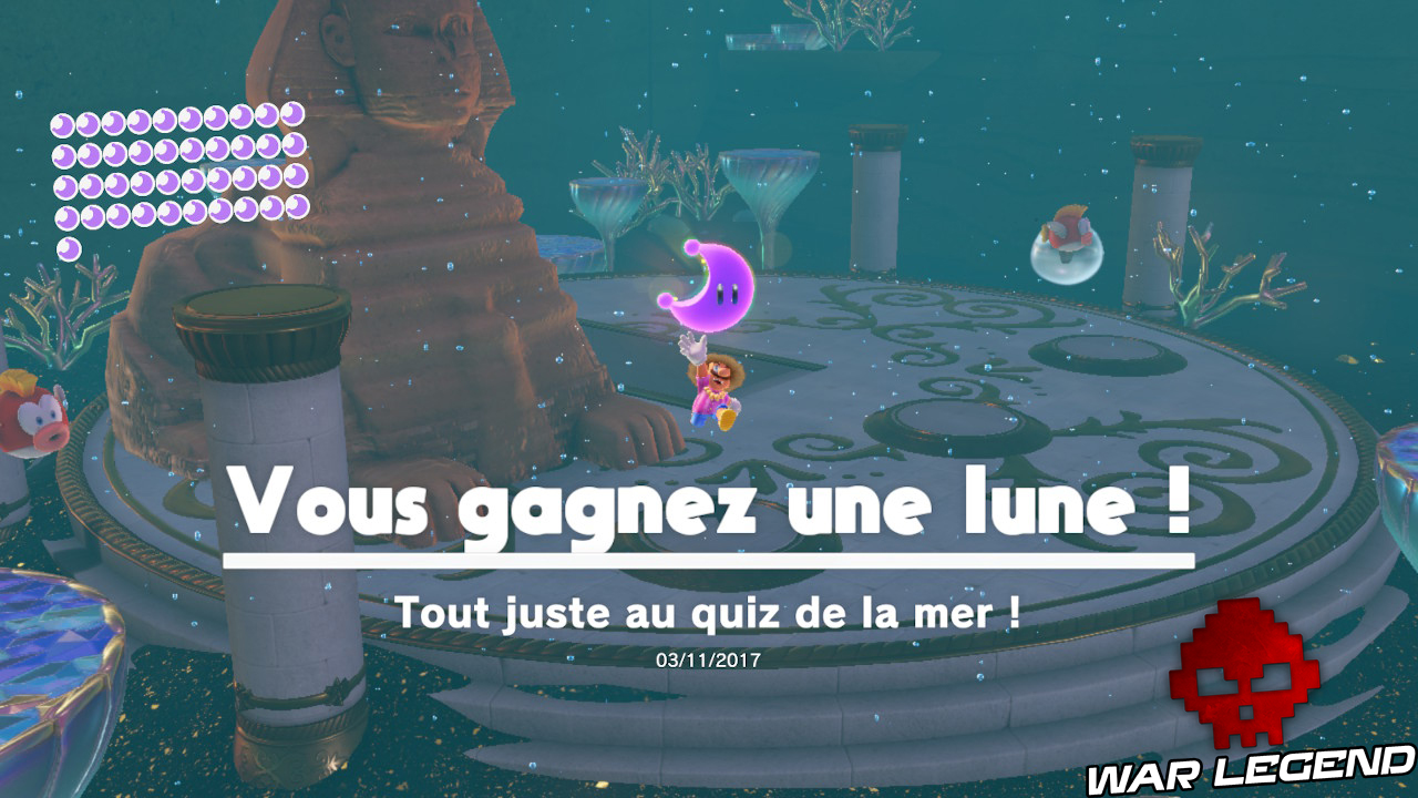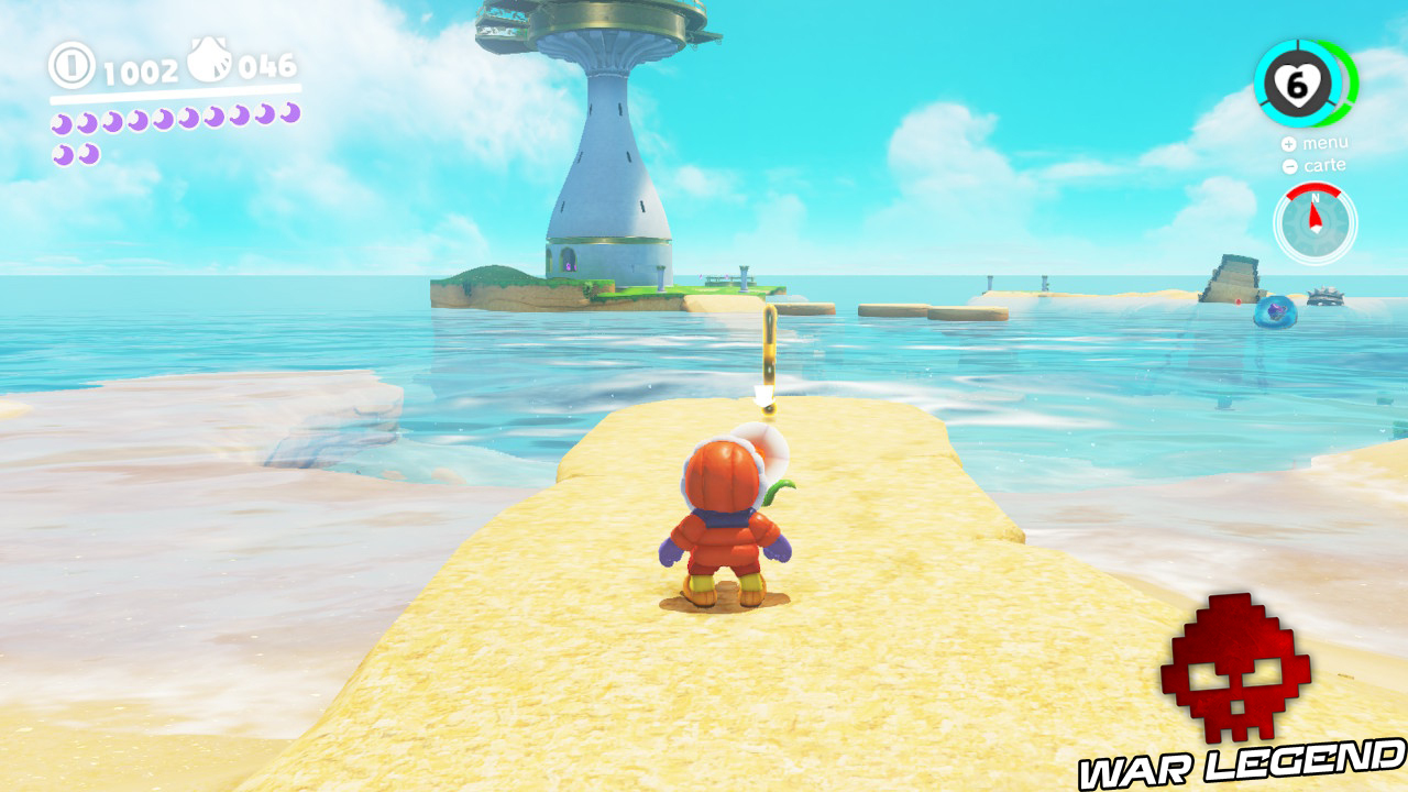 En sortant de l’Odyssée allez tout droit et vous trouverez sur un petit promontoire de la plage une fleur ainsi qu’une clé de fa. Positionnez-vous devant la fleur, alignée avec la clé, et utilisez le chapeau. Vous n’avez plus qu’à maintenir le cap tout droit pour faire apparaître une Lune.