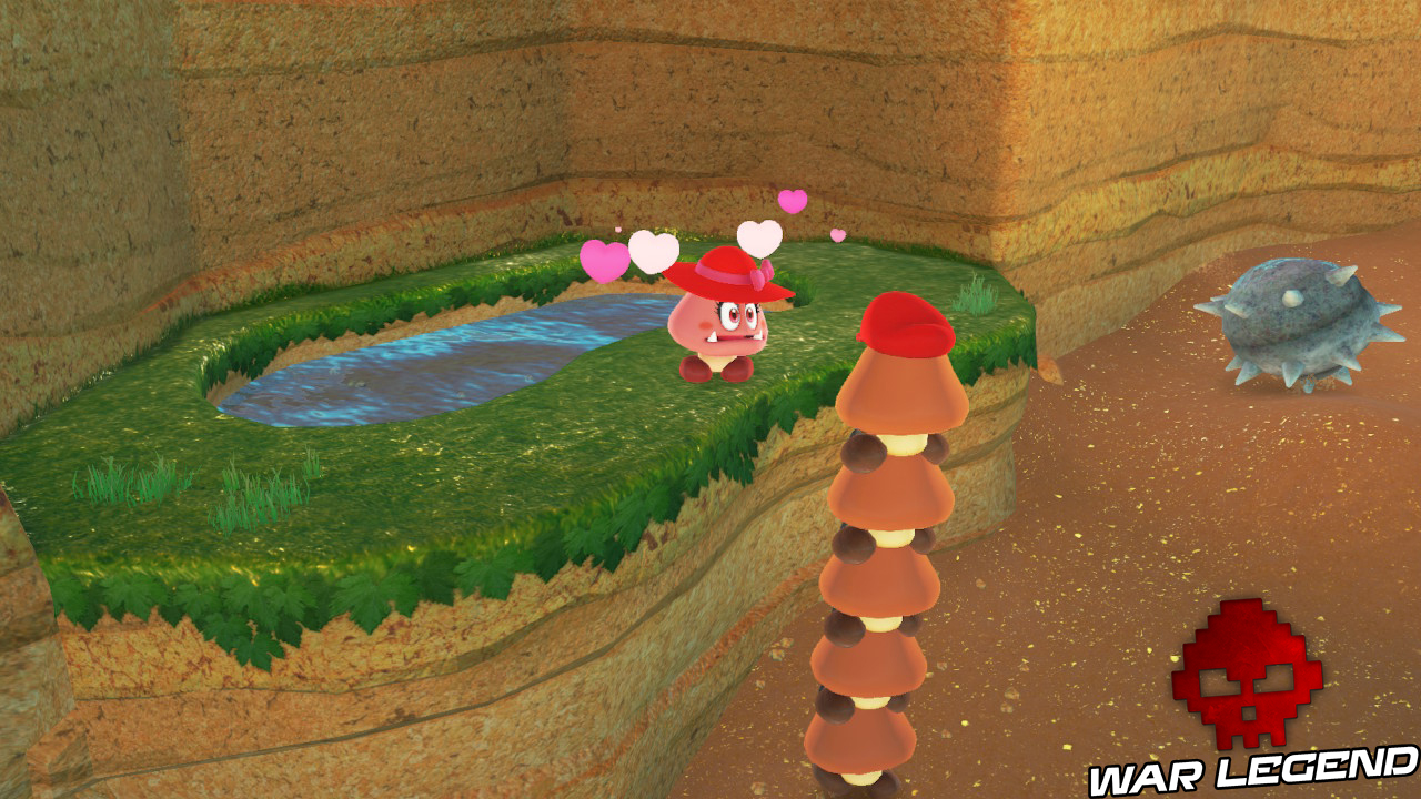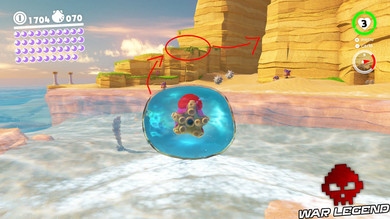 Derrière l’Odyssée, traversez le petit bras d’eau et empilez des Goombas puis dirigez-vous vers la pente sur laquelle roulent des coquillages à piques. Remontez-la et trouvez la Goomba femelle qui vous donnera une Lune à votre approche.