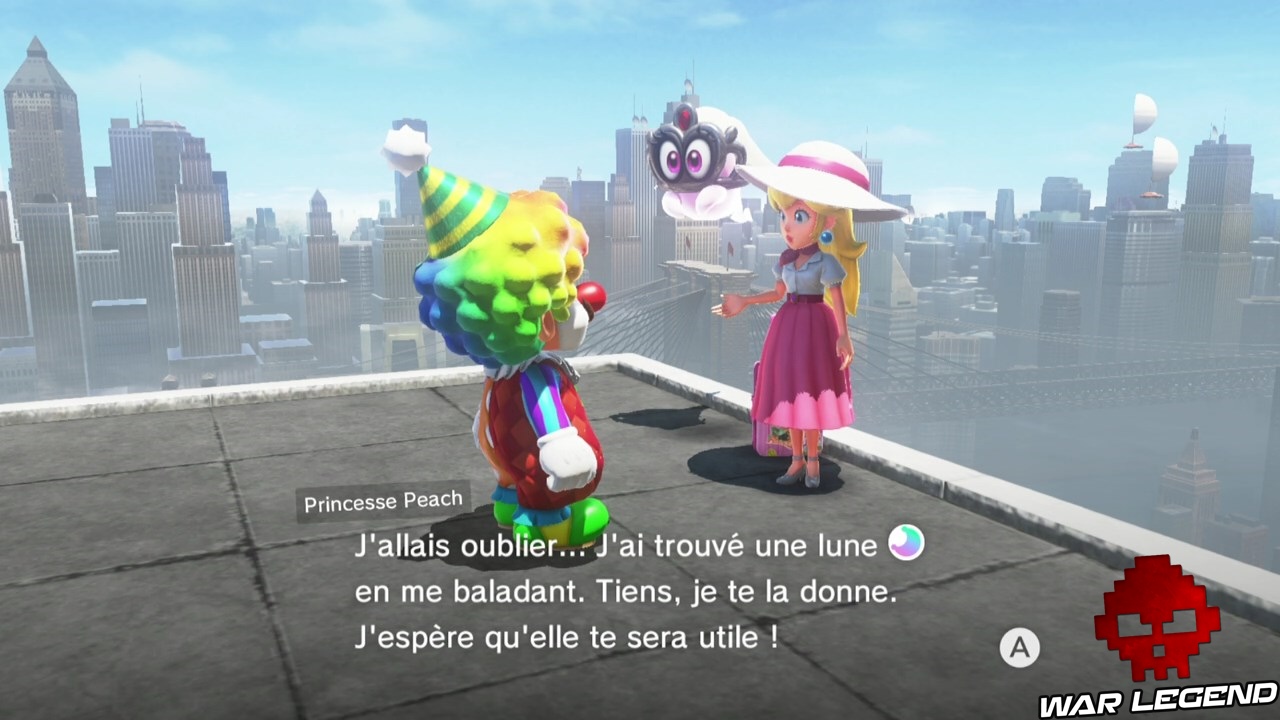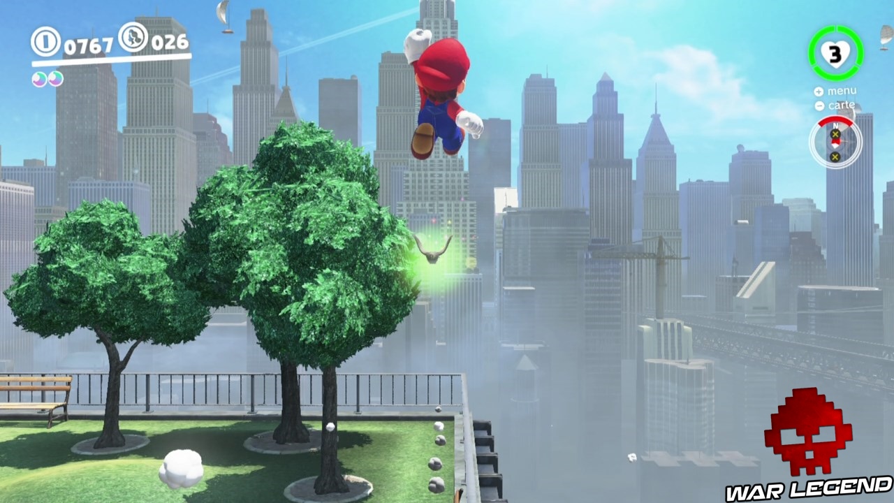 Dans le petit parc au nord-est de ce Pays, patientez comme dans la capture d’écran ci-dessous, lorsque le volatile arrive, sautez et jetez-lui votre chapeau pour gagner cette lune.