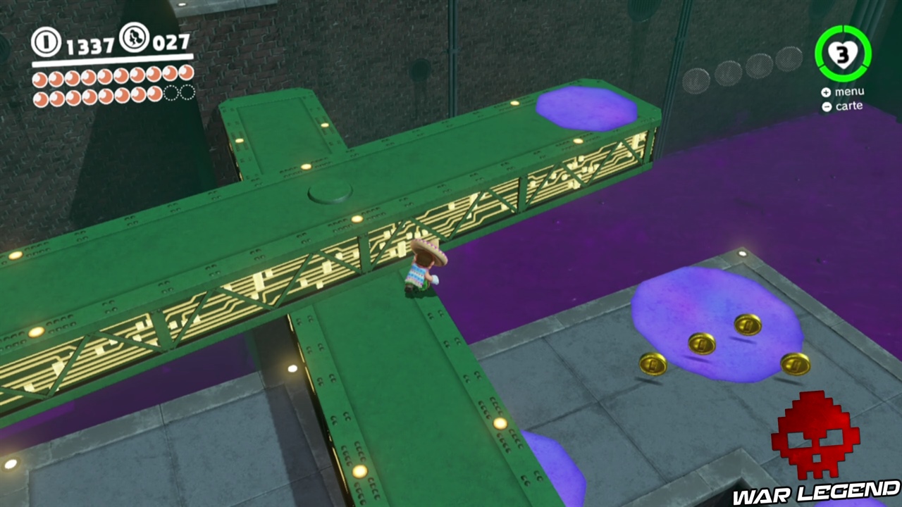 La quête principale se poursuit, rendez-vous au point jaune de la carte et prenez possession de la plaque d’égout pour pouvoir y rentrer. Utilisez votre chapeau pour faire tourner les plateformes. Attention à mi-niveau, juste avant de prendre un tuyau, il y a la lune 35 à récupérer ! A la fin du niveau, vous devez abattre deux grosses plantes, tirez leur dessus puis sautez-leur sur la tête pour en venir à bout.