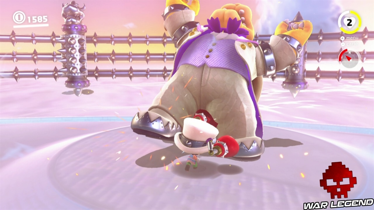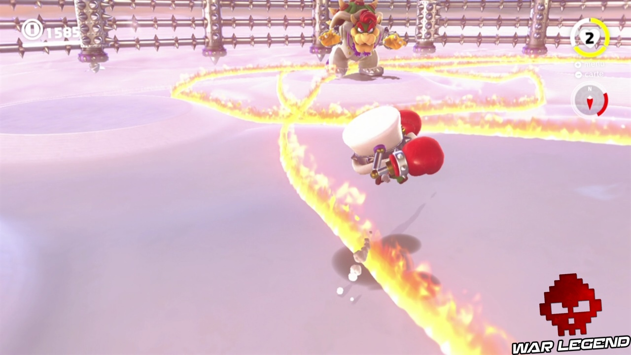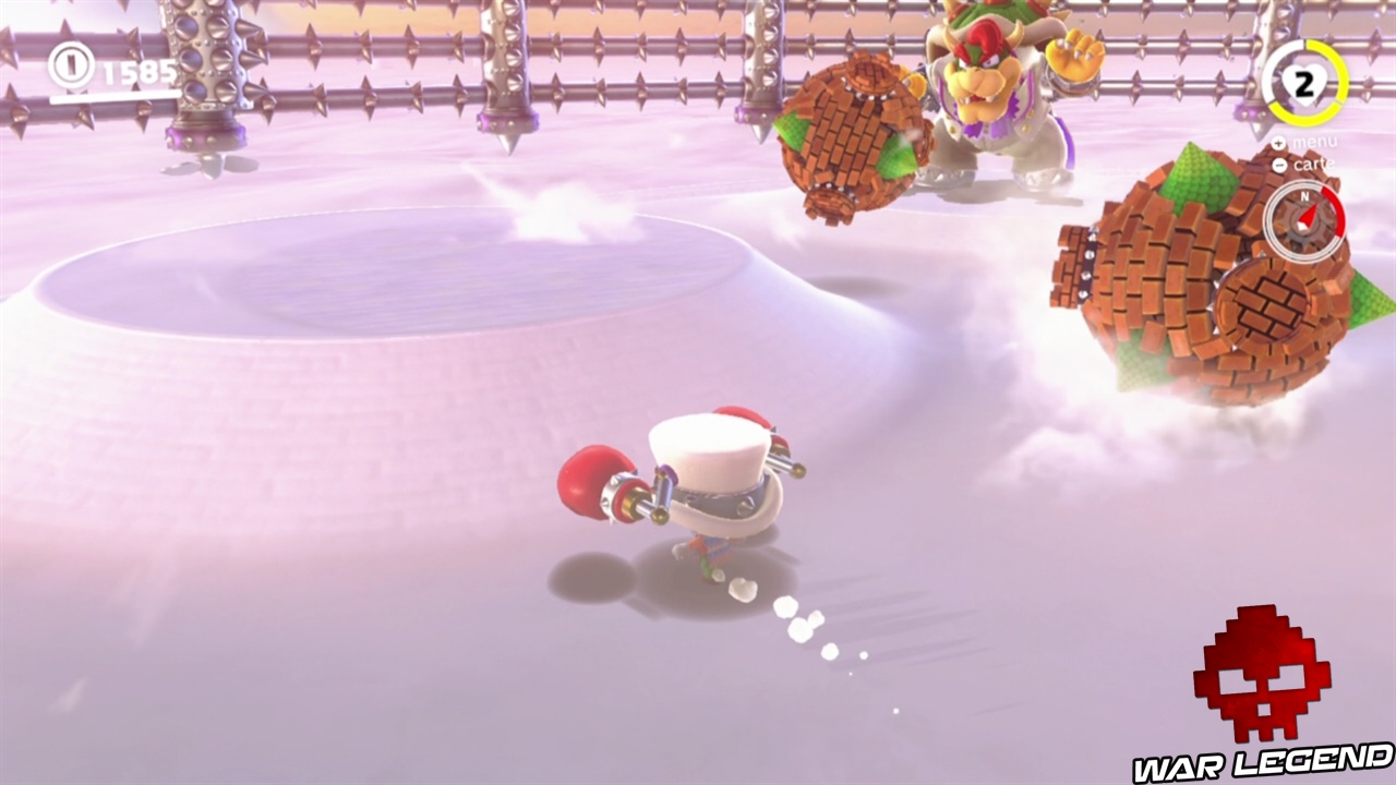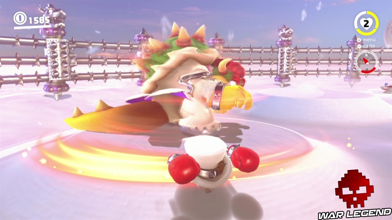 Bowser vous envoie son chapeau blanc, tapez-le avant qu’il vous touche puis prenez son contrôle en allant dessus. Vous voilà armé de gants de boxe, ça va cogner ! Attention Bowser vous envoi des vagues de feu, esquivez les en sautant par dessus puis courez-lui dessus et boxez le au corps à corps !