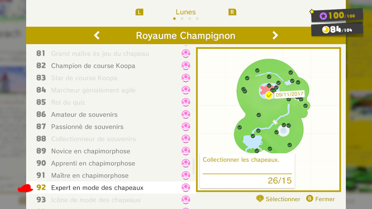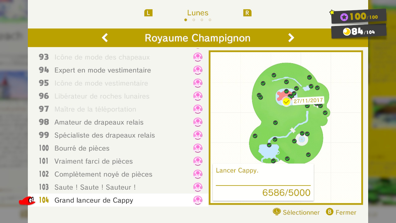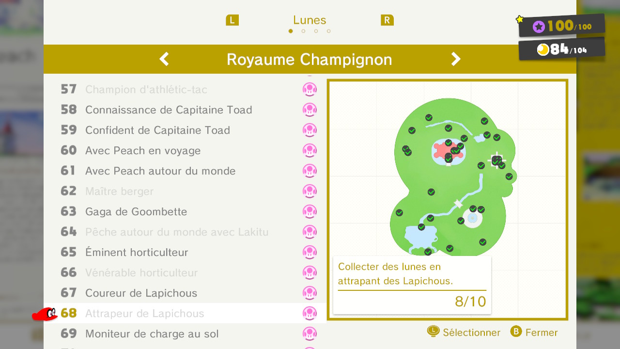 Une fois que vous avez rencontré Toadette, ouvrez la liste des lunes du Royaume Champignon pour consulter ces défis, ainsi que votre progression pour chacune d’elles. Une fois que vous avez rempli les conditions d’un défi, allez lui parler pour récupérer les lunes qui vous sont dues. Cela peut parfois être un peu long, car il faut rengager la conversation pour CHAQUE lune.