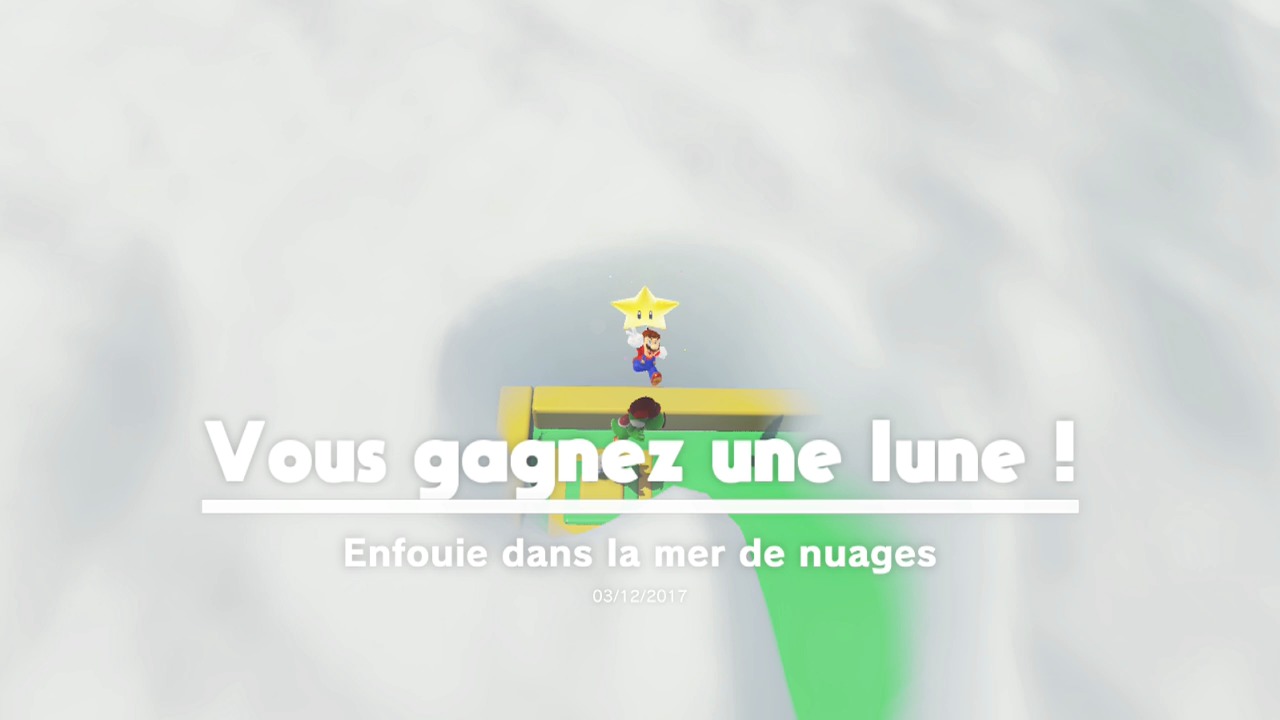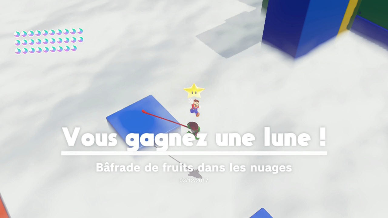 Il y a un trou dans la rambarde près du tuyau d’entrée. N’ayez pas peur et laissez-vous tomber. Une plateforme est cachée dans les nuages. Allez rejoindre directement l’étoile un peu plus loin.
