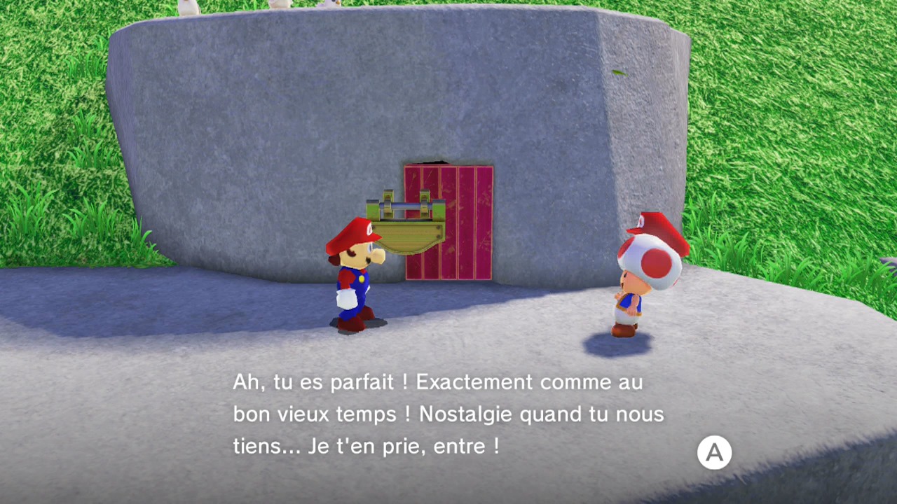 Tout d’abord, achetez à l’aide de pièces violettes la tenue rétro de Mario 64 dans la boutique du royaume.
