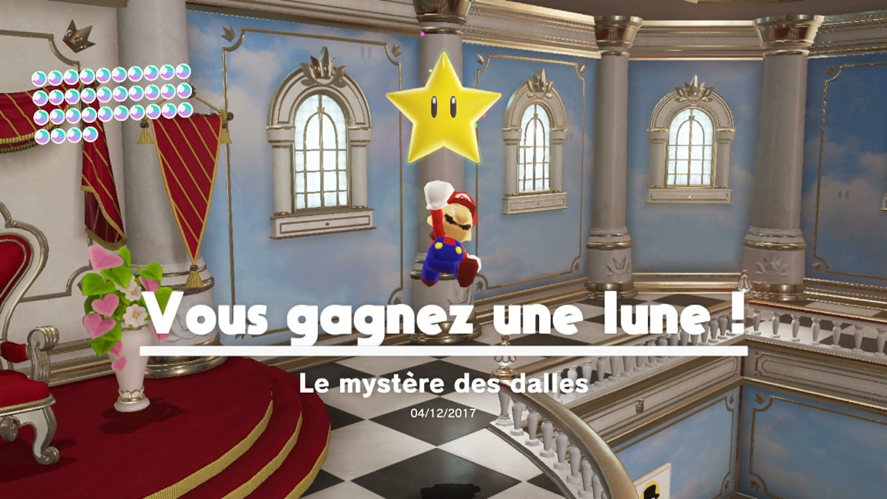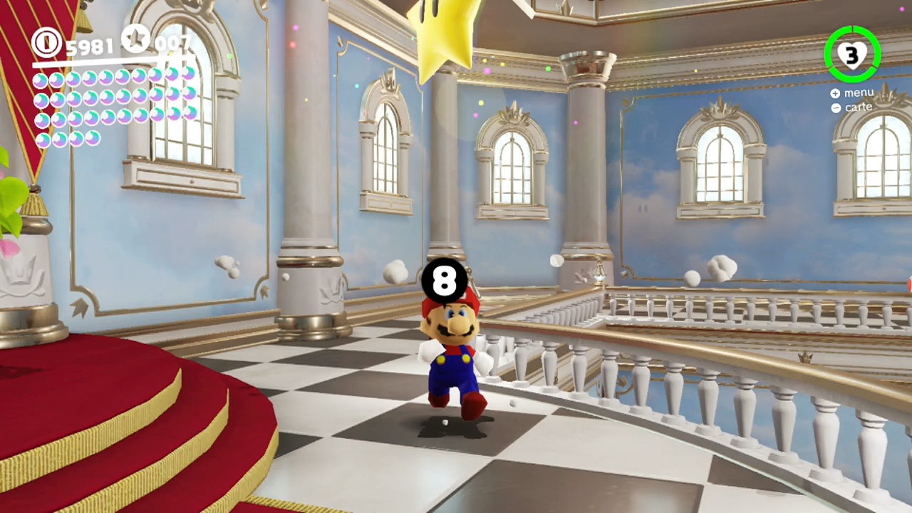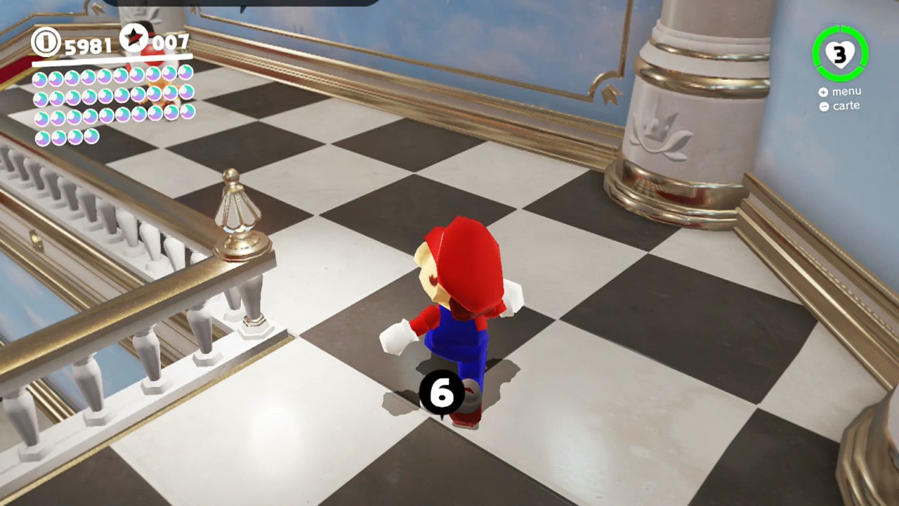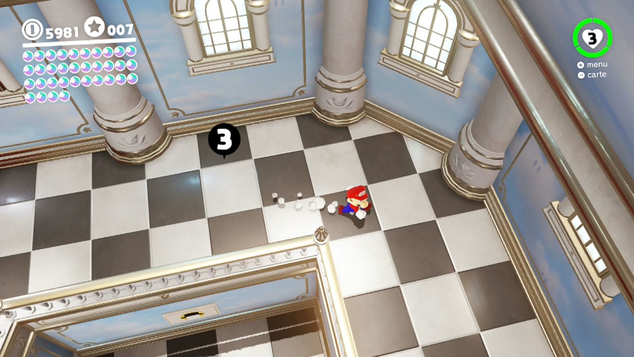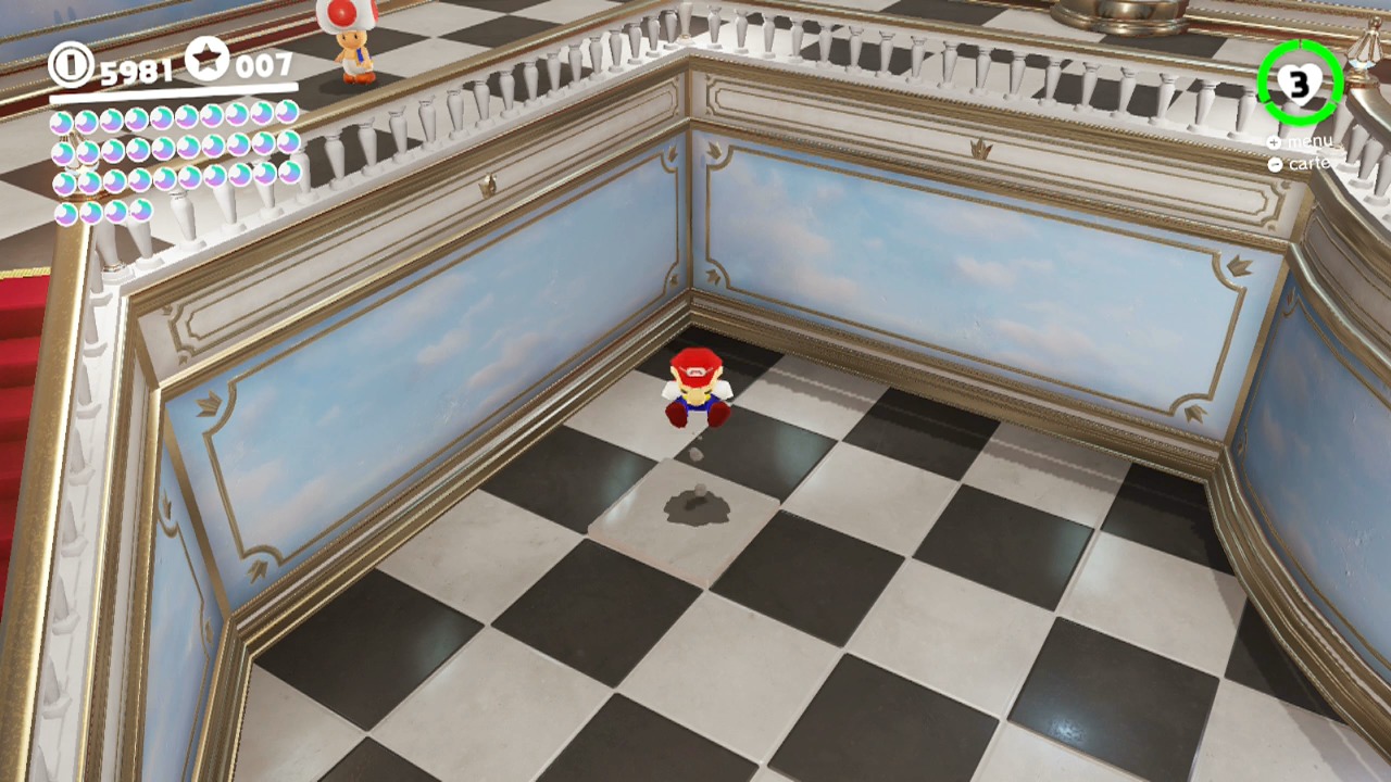 Une dalle dépasse du sol dans le château de Peach. Faites une charge au sol pour la remettre en place. Cependant, elle est dissidente et se déplace dans toute la salle. Répétez l’opération 8 fois pour récupérer une étoile.