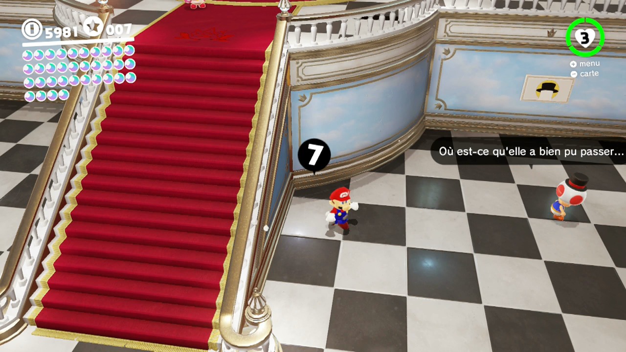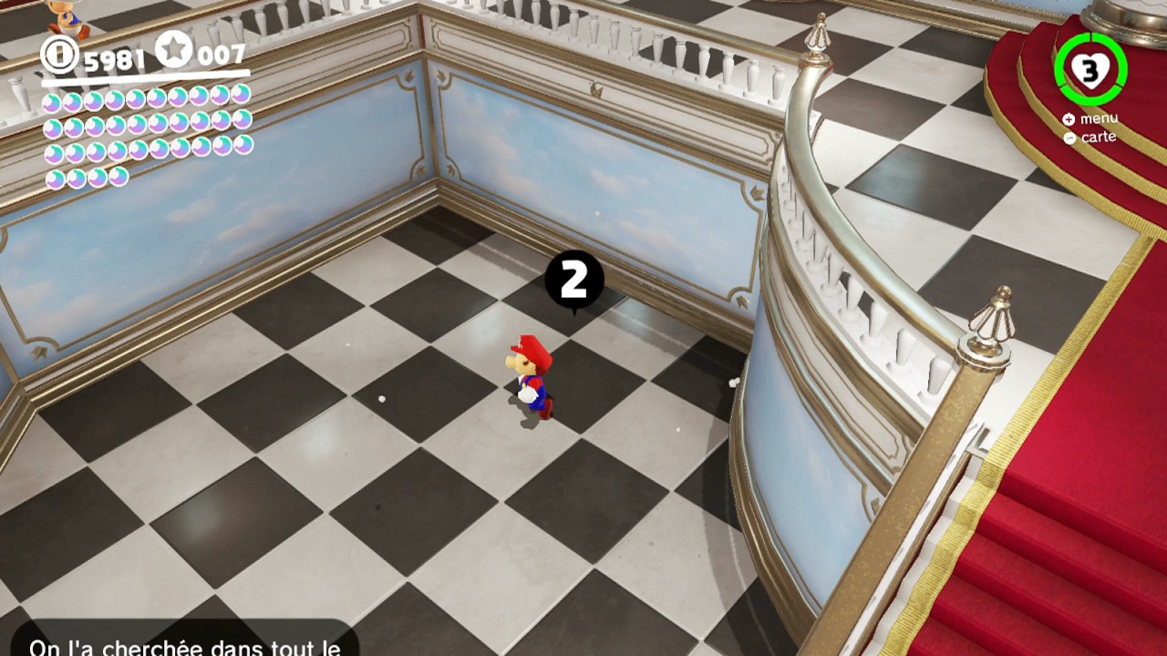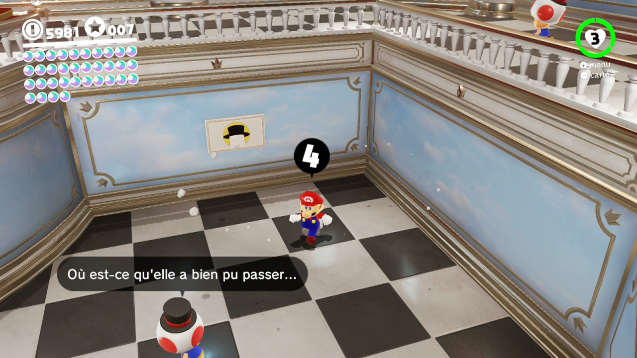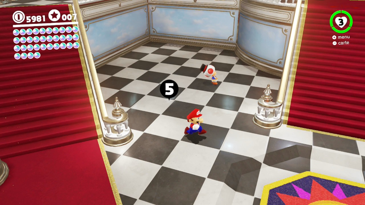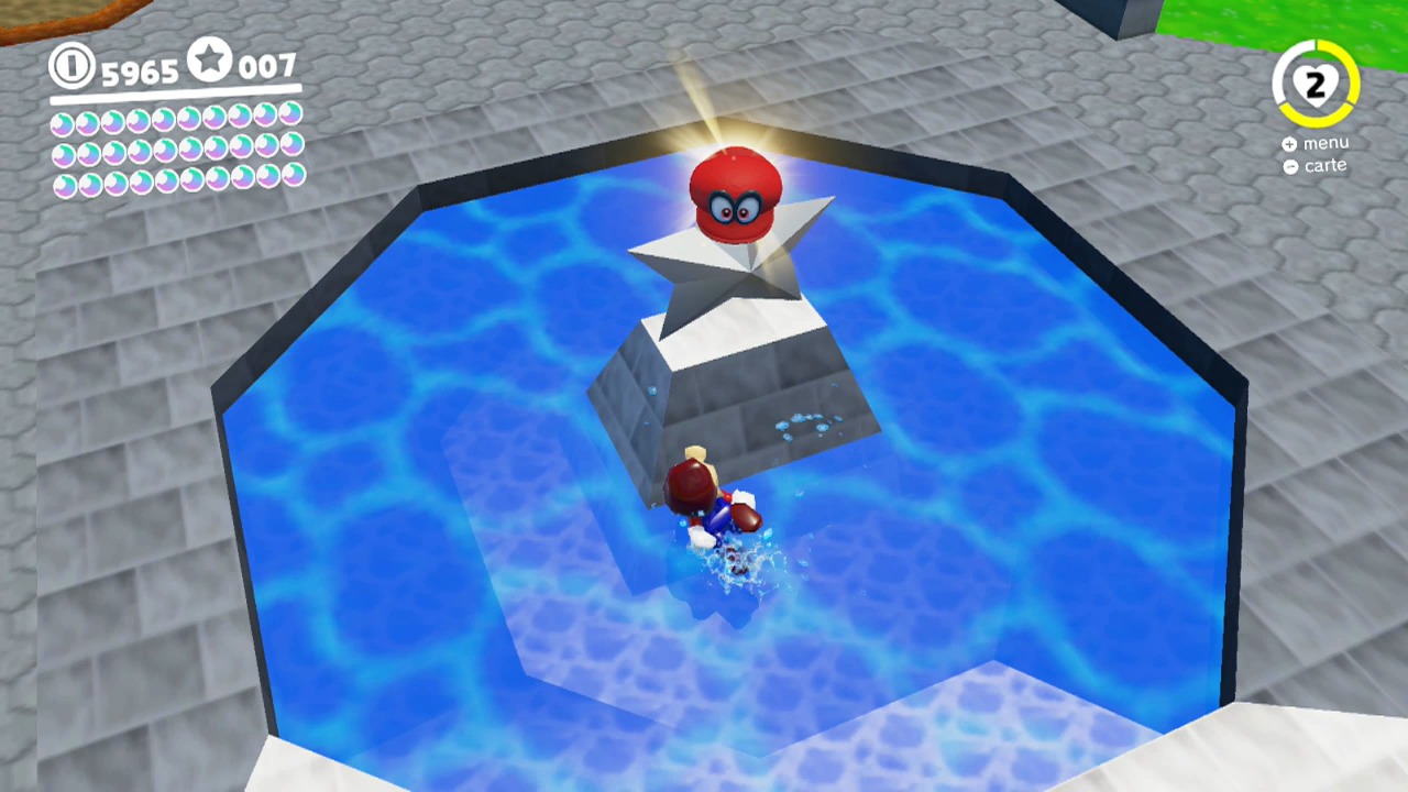 Une dalle dépasse du sol dans le château de Peach. Faites une charge au sol pour la remettre en place. Cependant, elle est dissidente et se déplace dans toute la salle. Répétez l’opération 8 fois pour récupérer une étoile.
