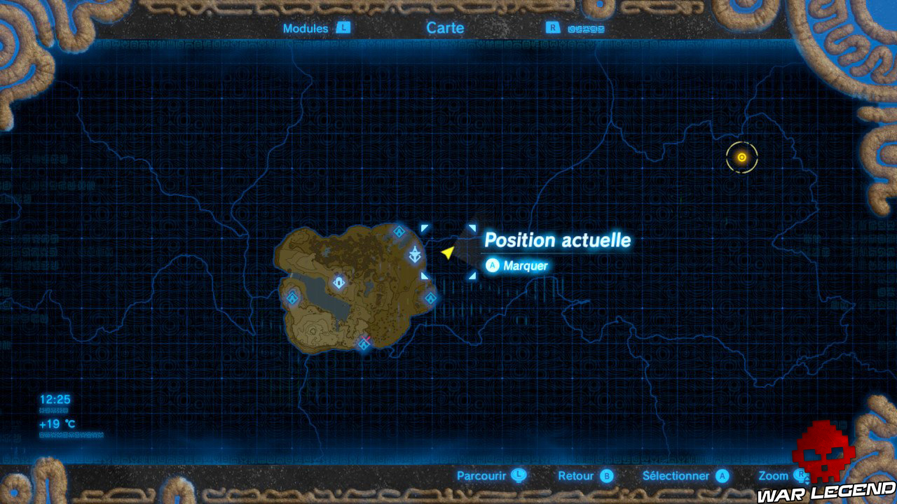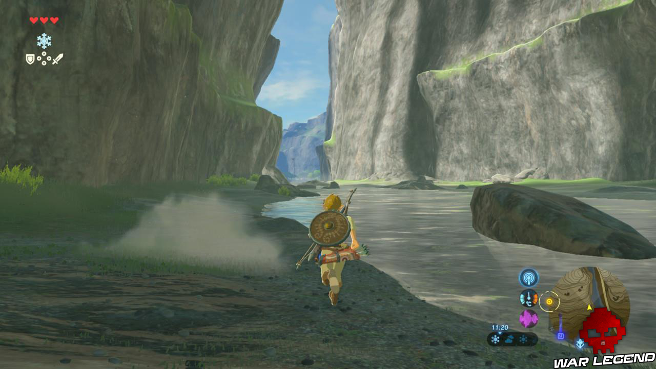 Une fois votre tablette mise à jour, vous disposez d’une carte de la région ainsi que du détecteur sheikah, qui vous permet de vous guider vers les sanctuaires encore non visités. Descendez de la tour et partez vers le sud, longez la montage sur votre gauche pour entrer dans un canyon.