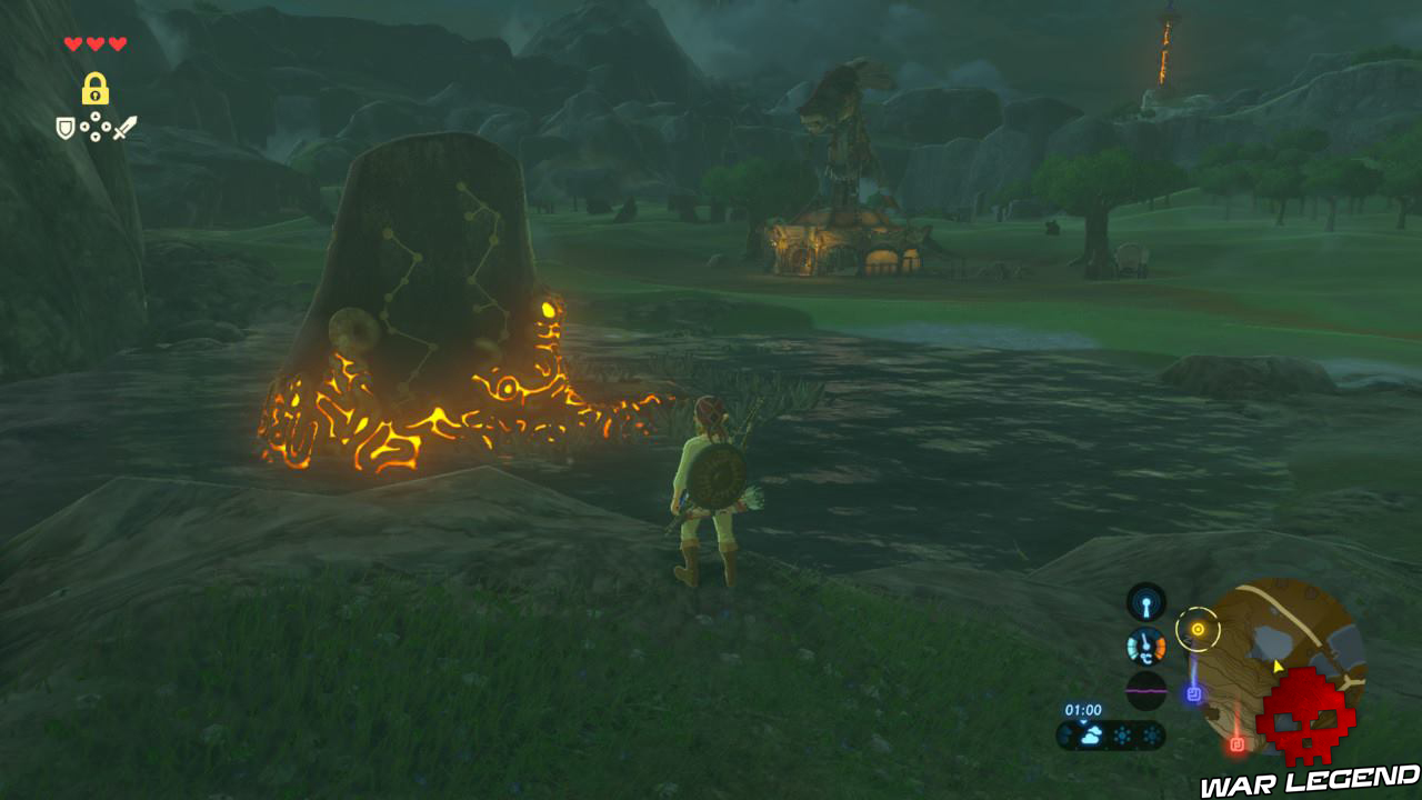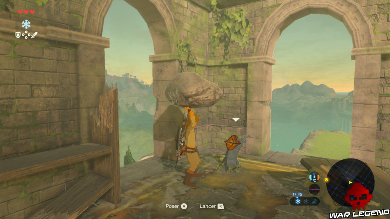 En avançant, vous trouverez plusieurs gardiens, inspectez-les pour récupérer des pièces mécaniques ; récupérez aussi les armes rouillées plantées un peu partout. À proximité du drapeau, un petite structure vous offre des escaliers menant à un coffre, allez-y et prenez l’Arc de voyageur. À partir de là, si vous partez plein sud, vous devriez apercevoir une ruine solitaire en haut d’une colline, allez-y, grimpez les escaliers et soulevez le rocher que vous trouvez pour révéler un Korogu.